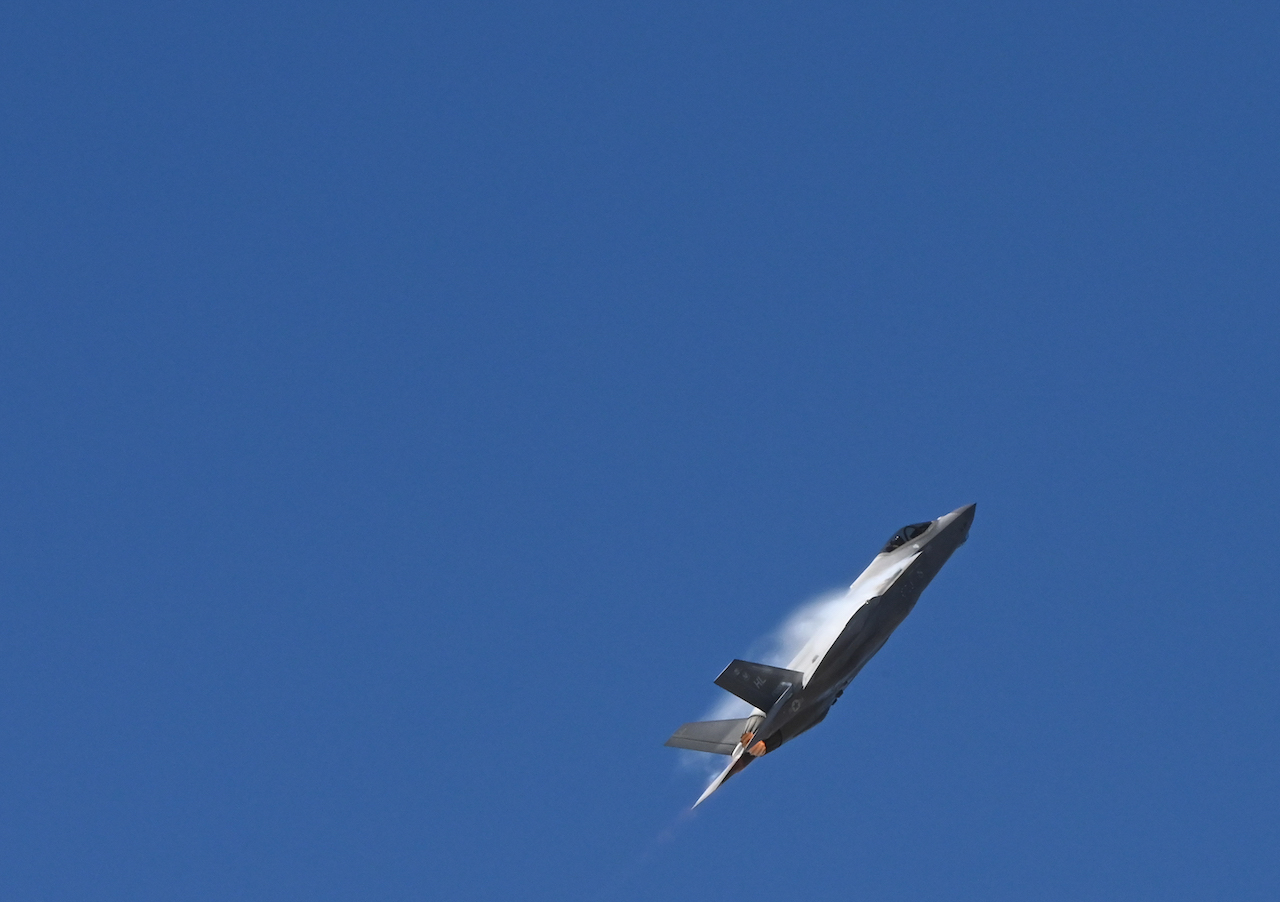 The Demo Team F-35 Lightning II soars during the Heritage Flight Training Course.[USAF photo by Staff Sgt. Nathan Call]