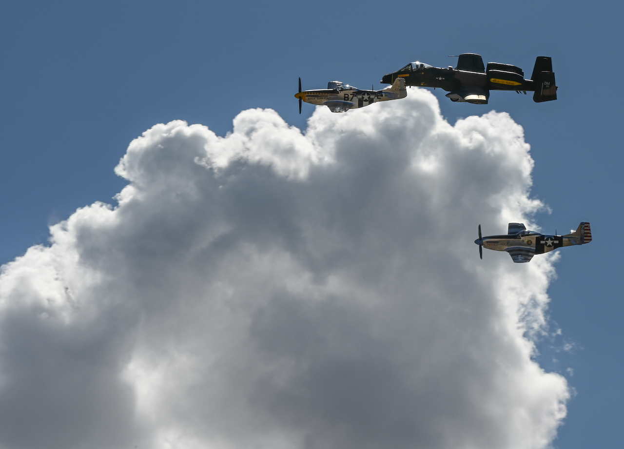 An atmospheric shot of the Demo Team A-10 Thunderbolt II flying alongside two P-51D Mustangs. [USAF photo by Staff Sgt. Nathan Call]