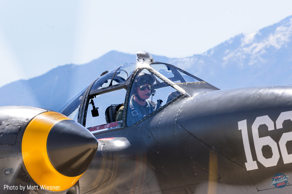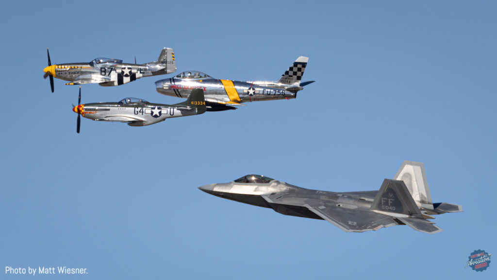 This year’s attendees included six North American P-51D Mustangs, one Lockheed P-38J Lightning, one Canadair Sabre Mk.6 (standing in for a North American F-86), and three Northrop F-5 Freedom Fighters, in addition to the Air Combat Command (ACC) contingent of two Lockheed Martin F-22A Raptors, two Lockheed Martin F-35A Lightning IIs, two Republic A-10C Thunderbolt IIs, and two Lockheed Martin F-16Cs. The warbirds, brought in by both Planes of Fame Air Museum and Comanche Fighters, comprised: