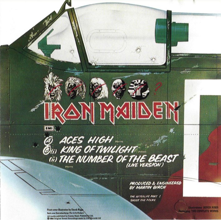 The back cover featured a side view of a plane with the confirmed kills underneath the pilot’s cockpit portrayed by other versions of “Eddie” that had appeared on some of the band’s previous album covers.