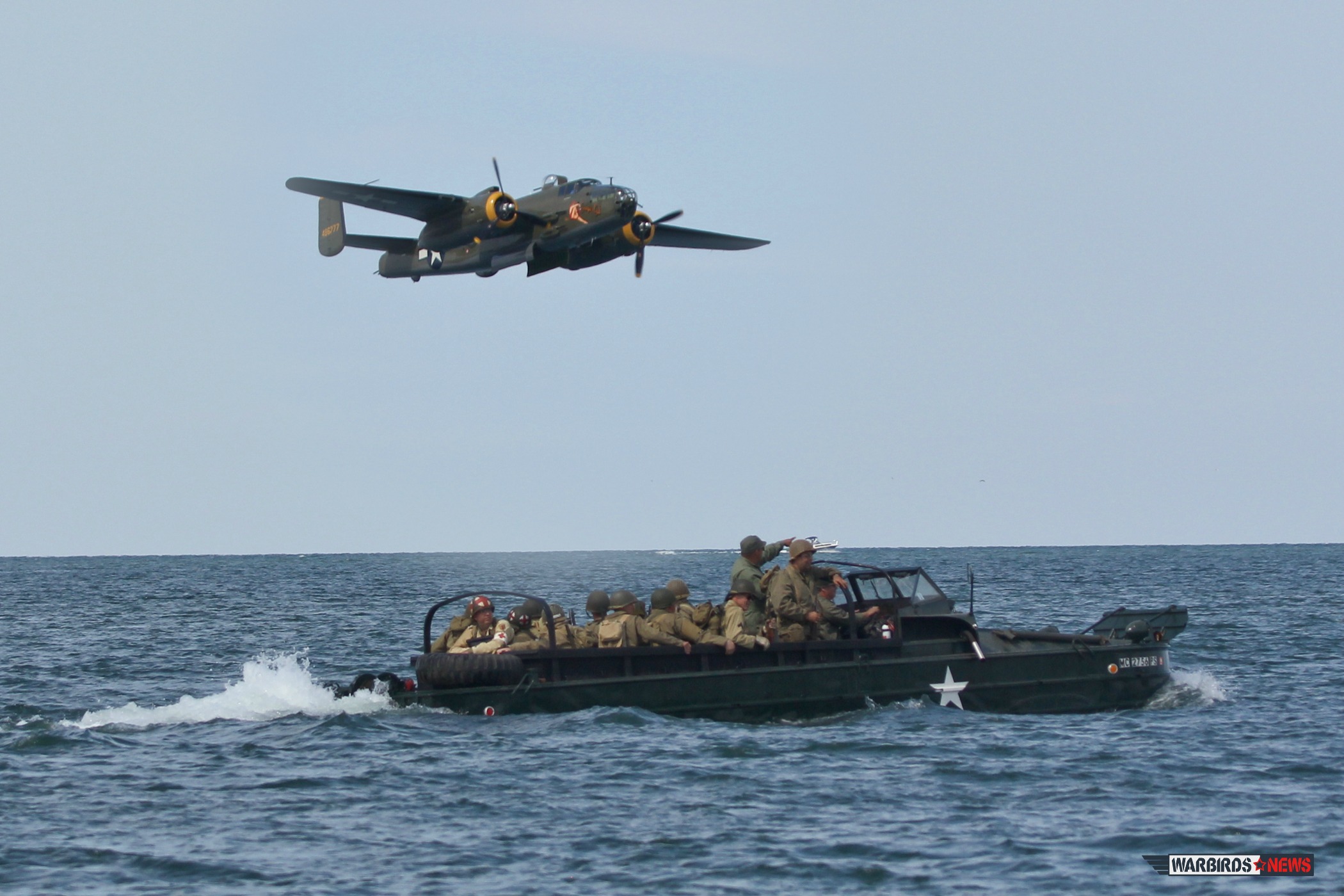 B-25 Mitchell “Georgie’s Gal,” bomb bay doors open, overflies the battle below. (Image Cradit: Tom Pawlesh)Four P-51 Mustangs come in low over Omaha Beach, the German gunners nervously wait until they are in range and then open fire. One P-51 is hit, with smoke trailing from its engine, it pulls up and out of the battle. A B-25 Mitchell Bomber follows, you can see the bomb bay doors open as it nears the beach, then you feel the concussion of exploding bombs. The invasion has begun!