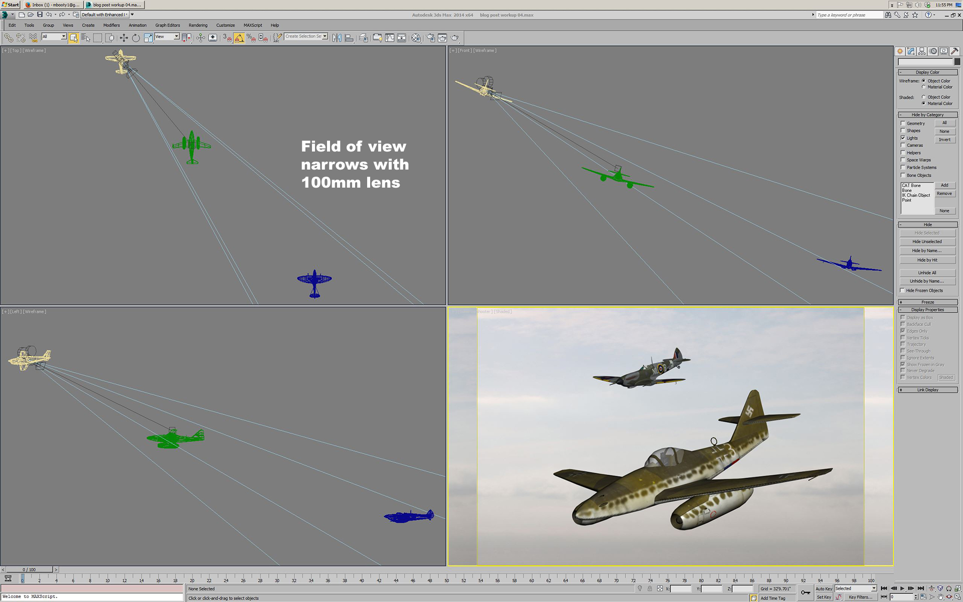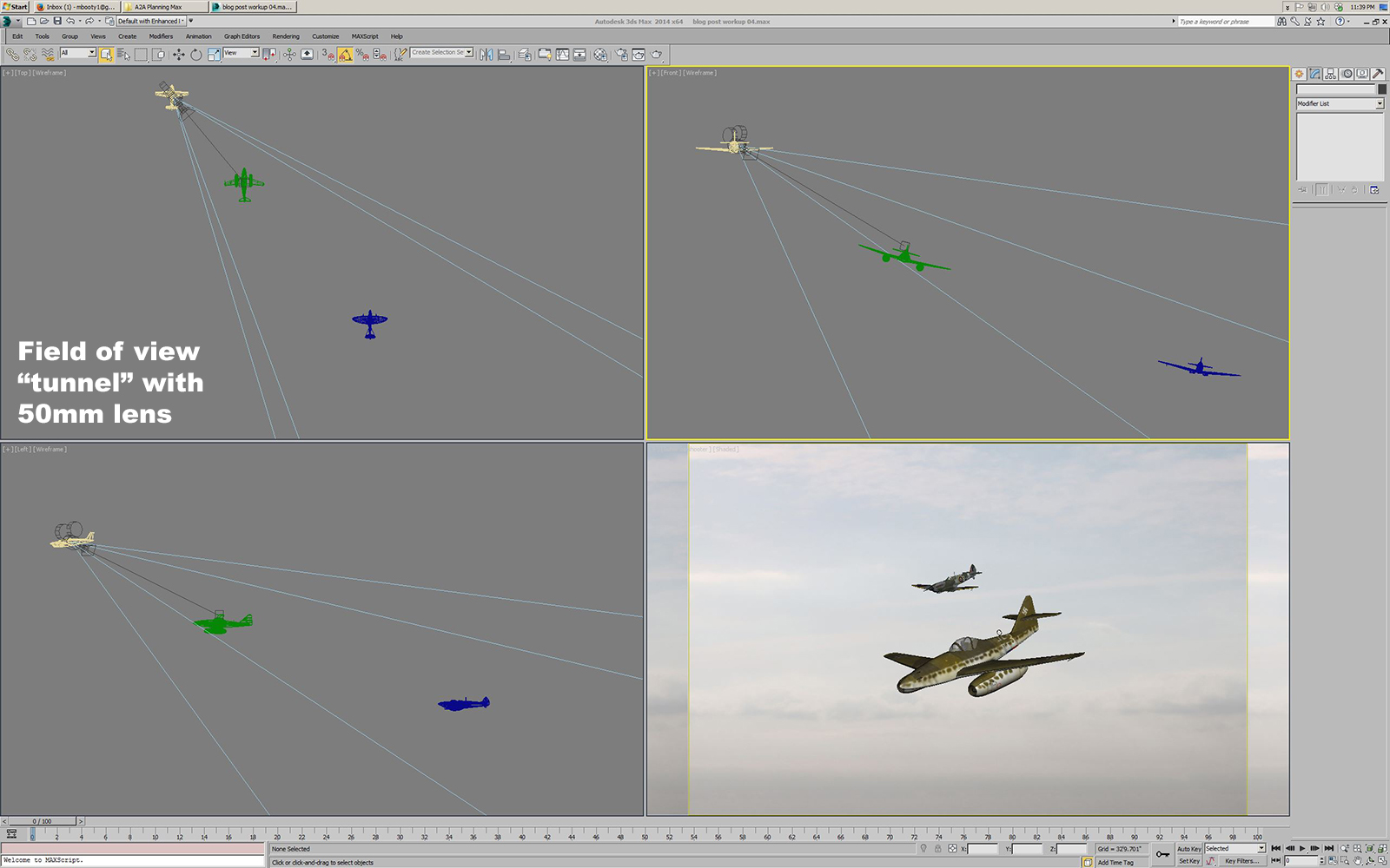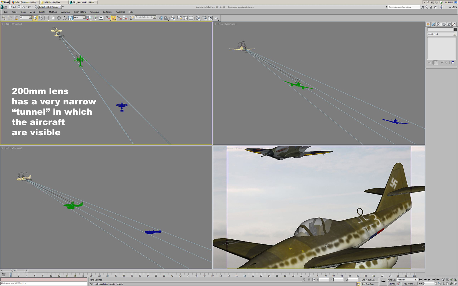 Autodesk 3D Studio Max (Max for short) is a complex, expensive software package used to create photorealistic computer graphics imagery (CGI) for everything from video games to architecture to big budget movies. I learned Max as part of my work in video games, and started out using version R4 running under DOS (before Windows!). I used it here because it’s what I know and I have a personal copy at home. While Max can do extremely complex animations and simulations, my working knowledge of it is focused on polygonal (“hard surface”) modeling and some basic to intermediate rendering and lighting setups (I know how to use probably 10% of what it can do). However, this turns out to be useful for this kind of pre-visualization, because the goal is not to create photorealistic imagery but rather to have an accurate representation of the aircraft in formation and a system that can handle real-world lens lengths.