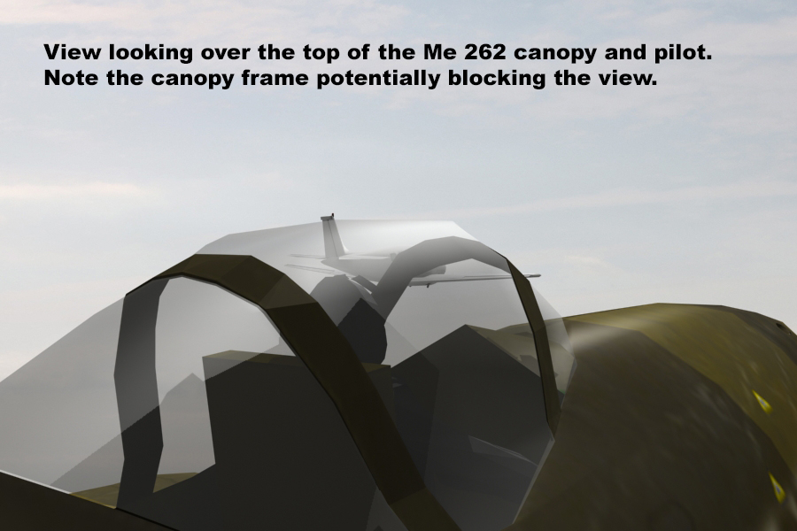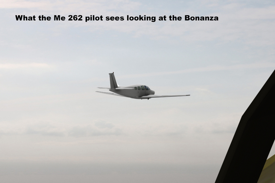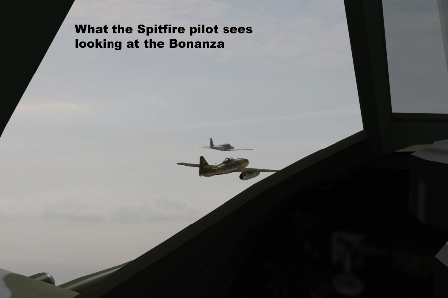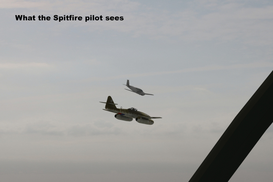 If we go to our “stacked” formation with the Spitfire behind and above the Me 262, we can see what the Me 262 pilot sees and what the Spitfire pilot sees: