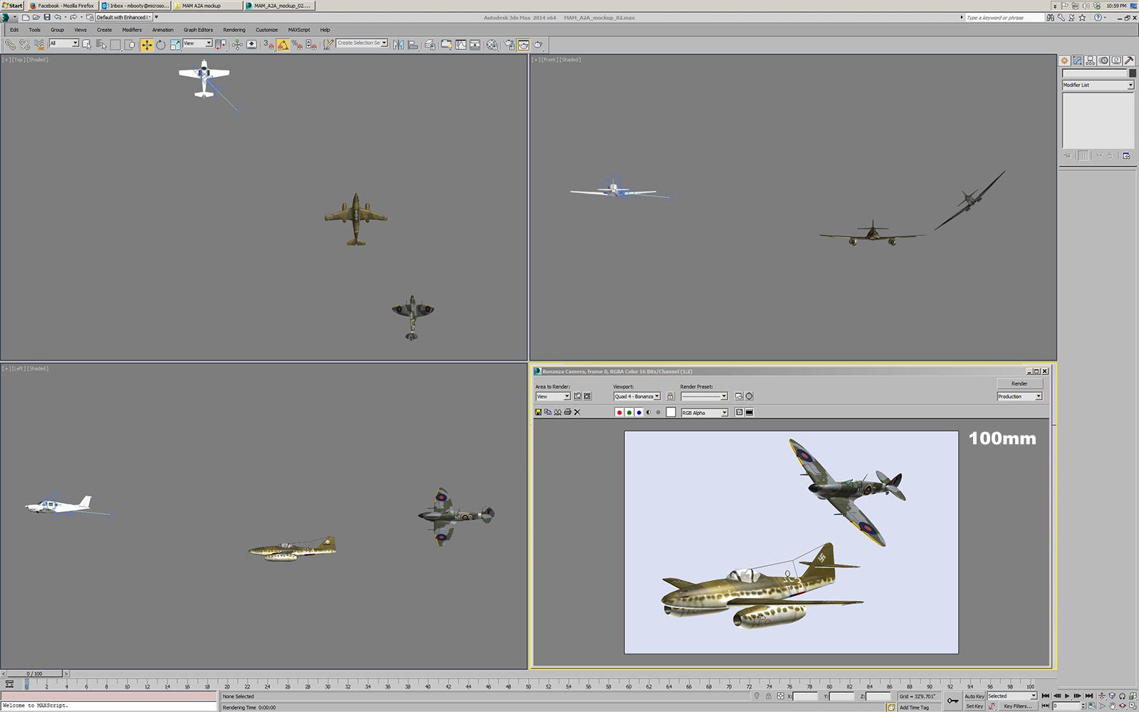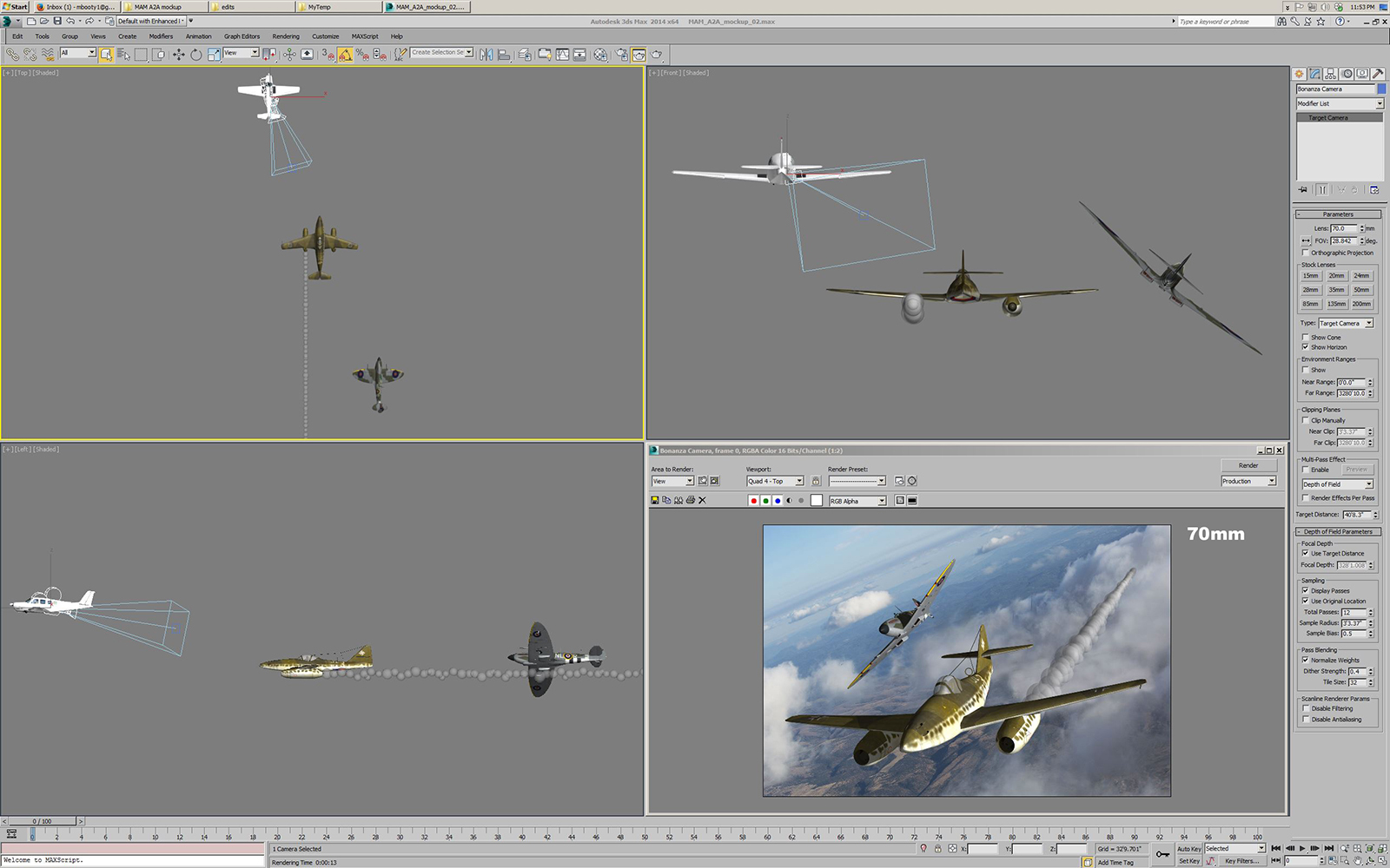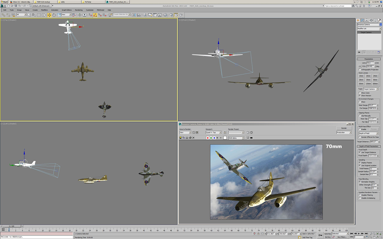 After finding and importing the various aircraft models, the next steps are to size them all to match their real world dimensions, place them in a 3D scene in Max, and add cameras for the photographer location and for the locations of the pilots in the subject planes.