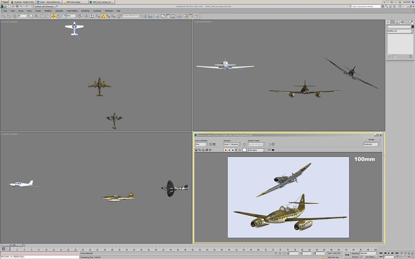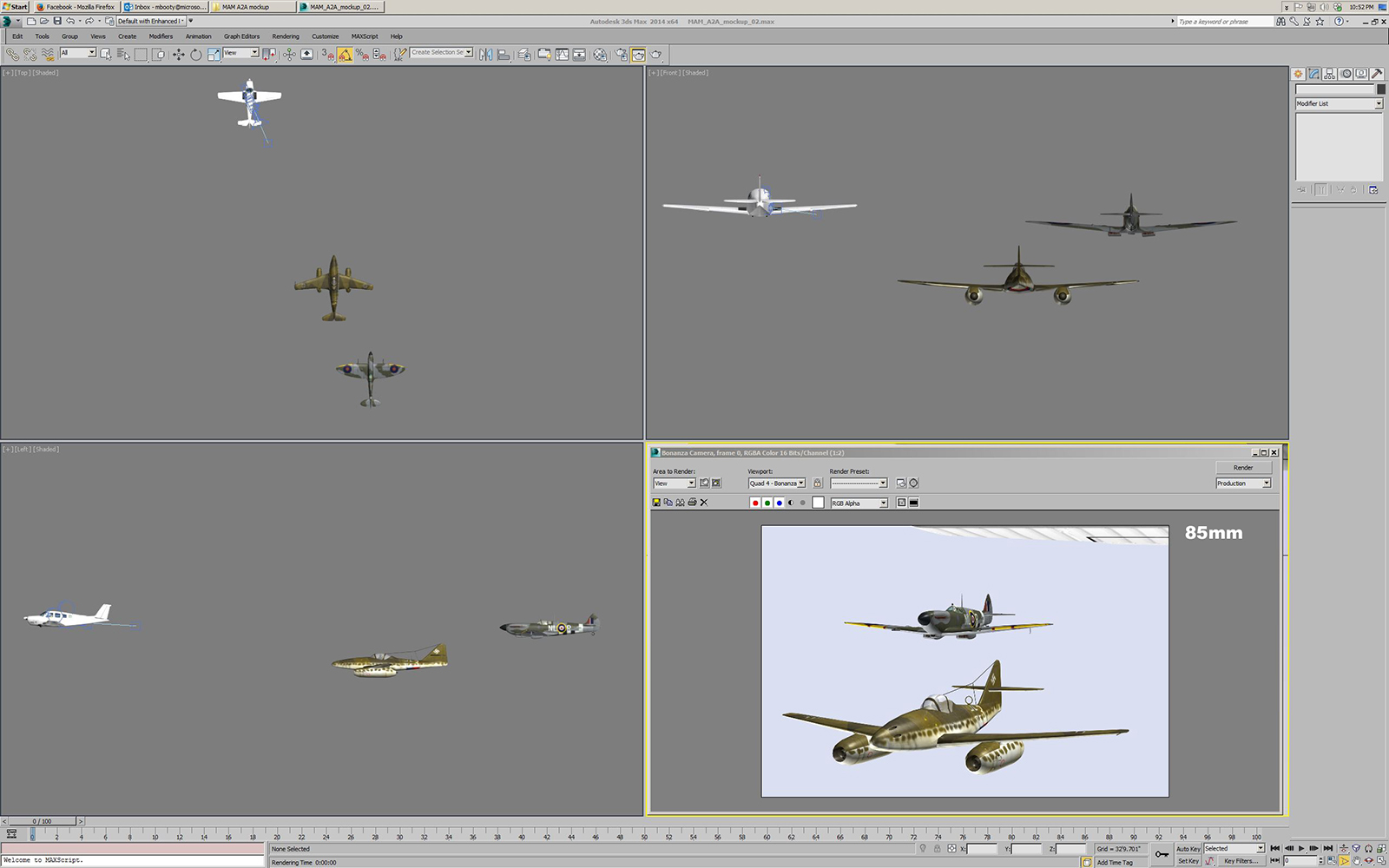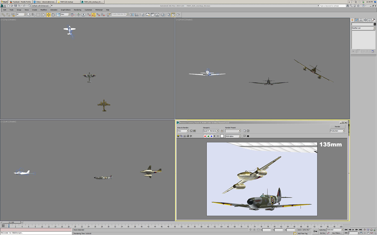 After finding and importing the various aircraft models, the next steps are to size them all to match their real world dimensions, place them in a 3D scene in Max, and add cameras for the photographer location and for the locations of the pilots in the subject planes.