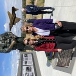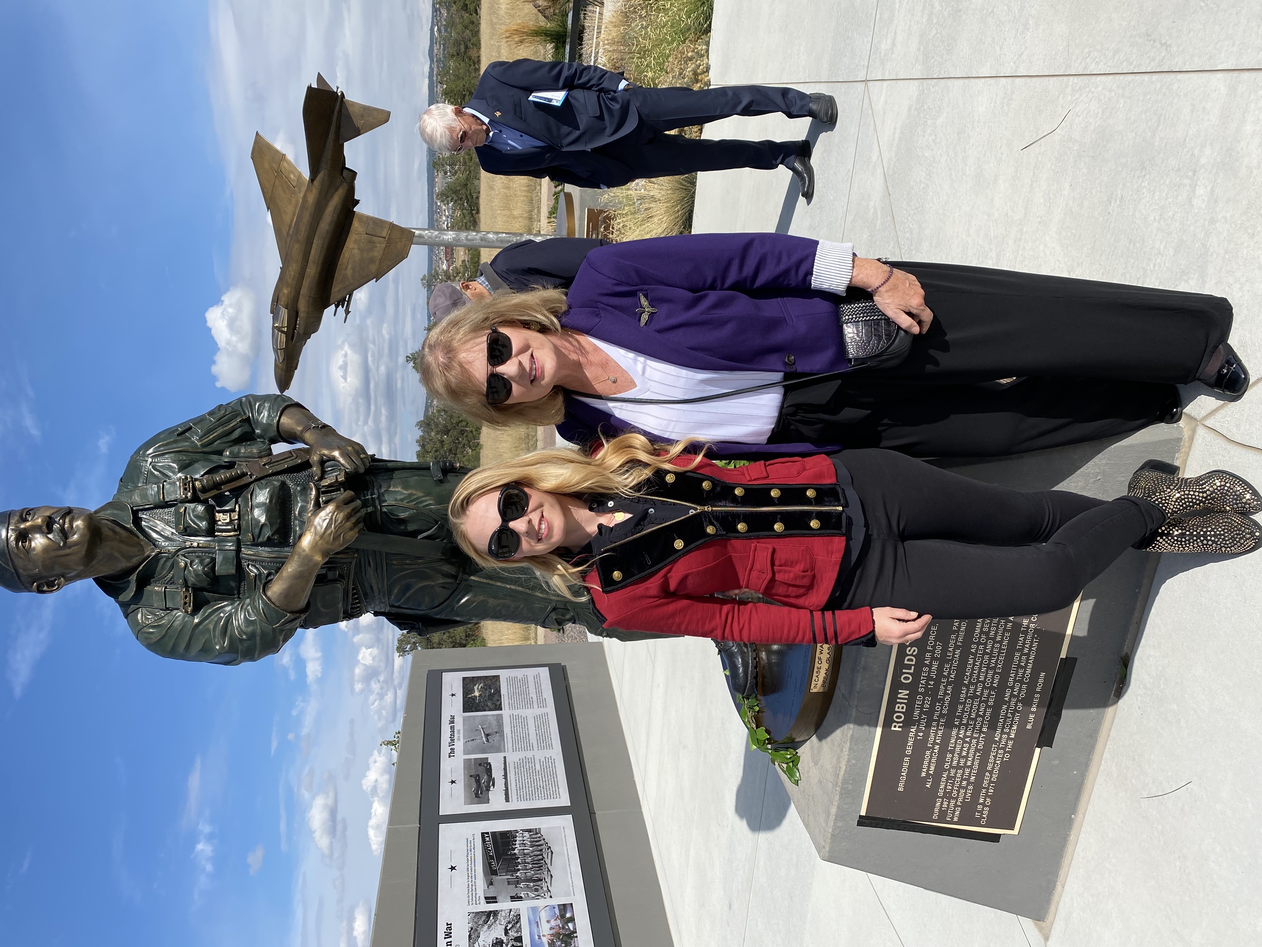 Christina Olds and her daugher Jenny posing in front of Robin Olds statue. Christina Olds