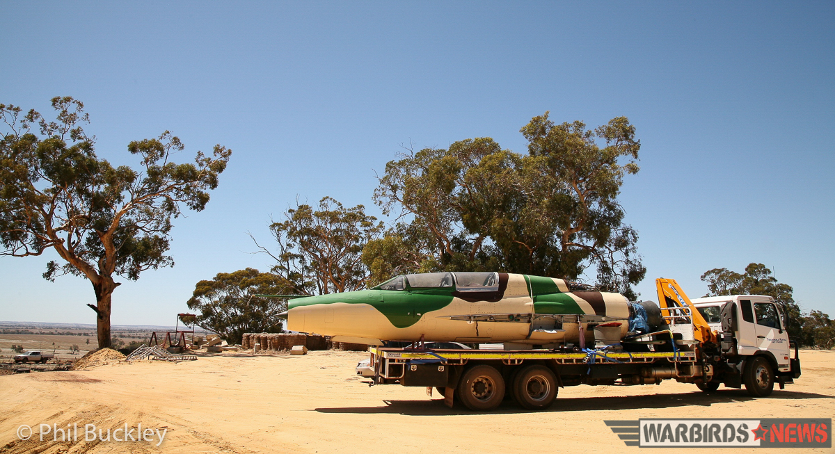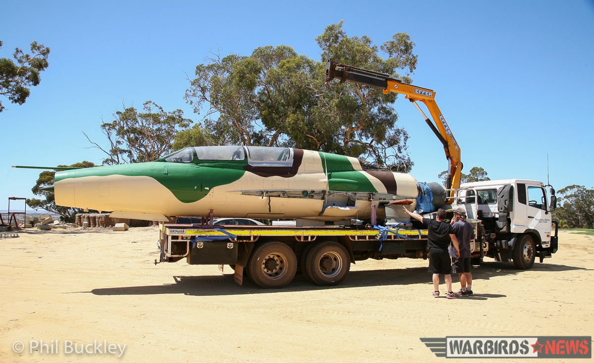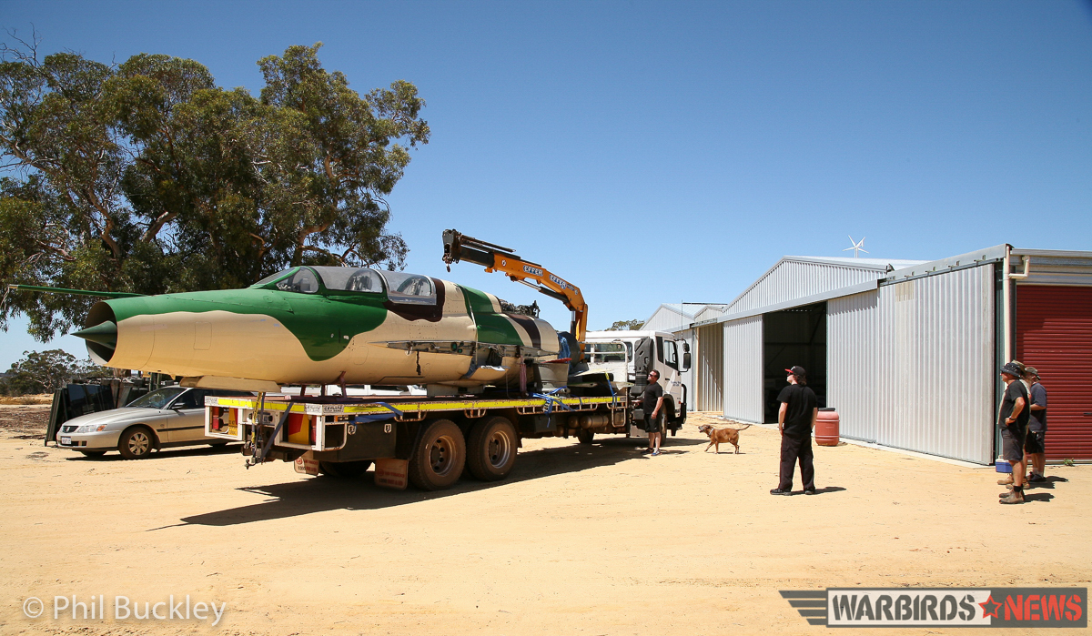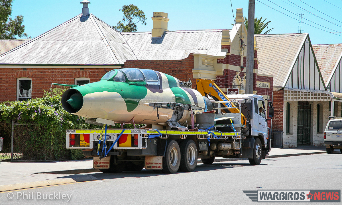 On February 4th, 2016, WarbirdNews correspondent Phil Buckley received an invitation from Adrian Deeth to join him as he transported the MiG from her old home in Perth to a country airport near York about 80km away. Deeth had found much more affordable hangar space at the wonderfully-named White Gum Farm airstrip, which prompted the move. So Deeth and a few friends hoiked the disassembled jet aboard a low-loader truck, and meandered their way through suburban streets of Perth in the middle of the day; the last thing office workers and drivers might have expected to see! As this angular and brutal looking 60s warrior progressed on her way, many people stared in disbelief at the fantastical sight.