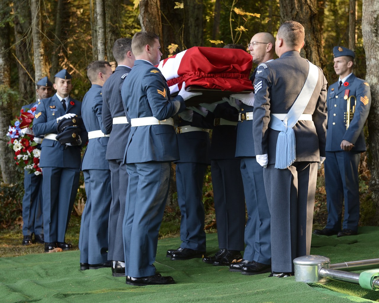 A memorial to the four airmen took place with full military honors at the Royal Oak Burial Park in Victoria, British Columbia on November 10th, 2014. The crew were interred together in a Commonwealth war Graves plot. Surviving relatives of the crewmen from Canada and England attended as did numerous Canadian military persona, three members from the Queen’s Colour Squadron of the Royal Air Force and Reverend Nick Barry, Deputy Chaplain-in-Chief Royal Air Force. Many decorated veterans and members of the public also came to pay tribute to the crew.