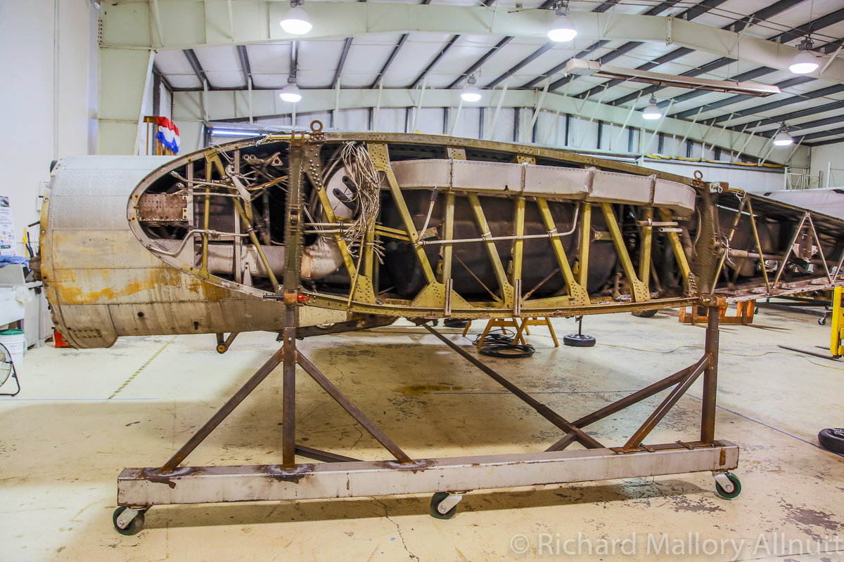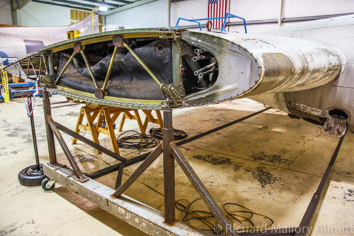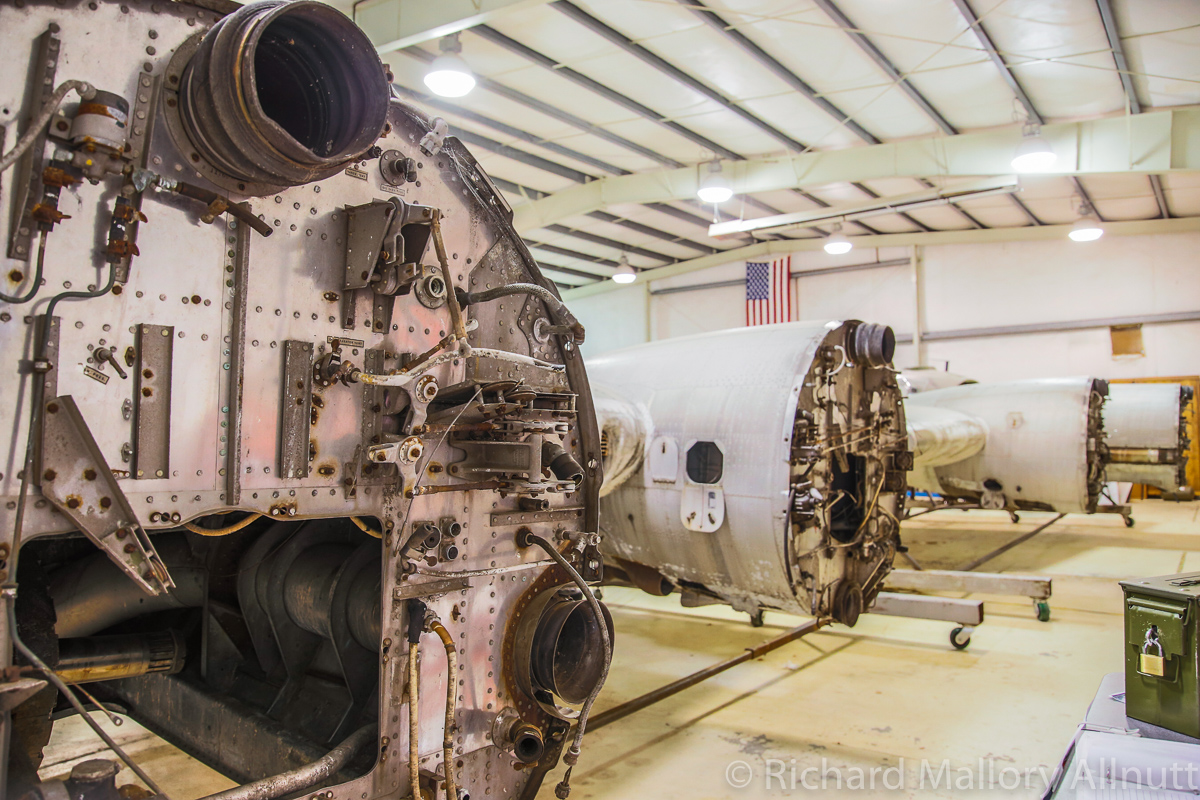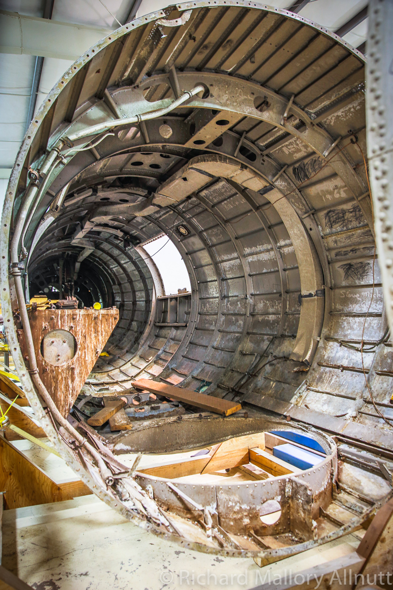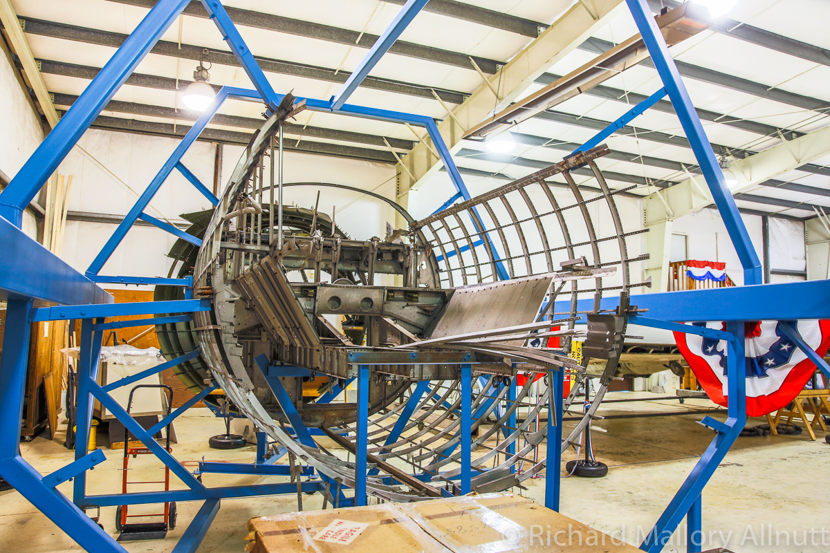 The B-17 Alliance Group is coordinating their efforts with several other B-17 restoration projects, and have acquired a jig for the main fuselage in the process. They recently installed the fuselage in this jig, and now comes the hard graft of restoring the bomber. Wandering around the hangar, which is filled to bursting with B-17 parts and components, was a fascinating exercise. When you enter from the museum exhibition room, the first thing you see is the fully restored, forward nose section…