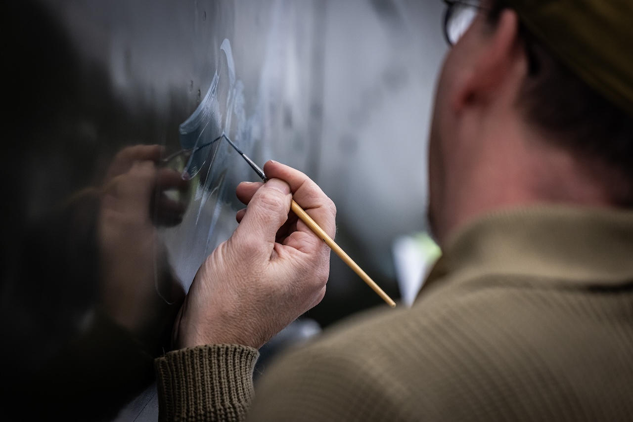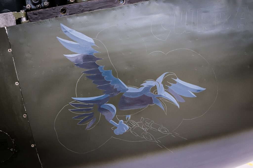 Once the design was finalized, the painting process began. Careful placement was key, ensuring symmetry on both sides of the fuselage. Chad worked methodically, mixing colors in advance to maintain consistency and painting in stages to allow for touch-ups. “I started with the base colors of the bird, then moved on to the guns and flames,” Chad recalled. “By the first night, most of the major elements were in place. The second day was about refining details—painting the cloud background, adding depth, and completing the black outlines, which took about four hours alone.” On the final day, highlights were added, and any imperfections were carefully corrected. “I went over everything, fixing lines, adjusting colors, and making sure every detail was just right. Finally, I signed my name small at the bottom, and we took some photos.”