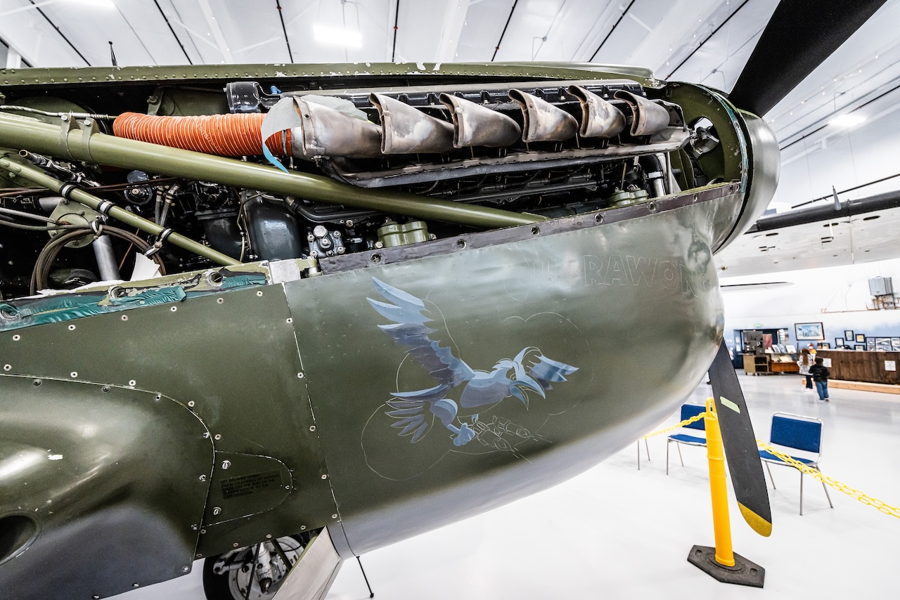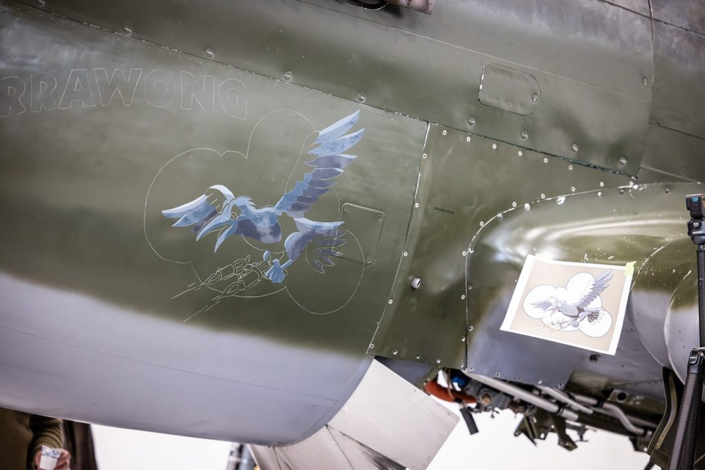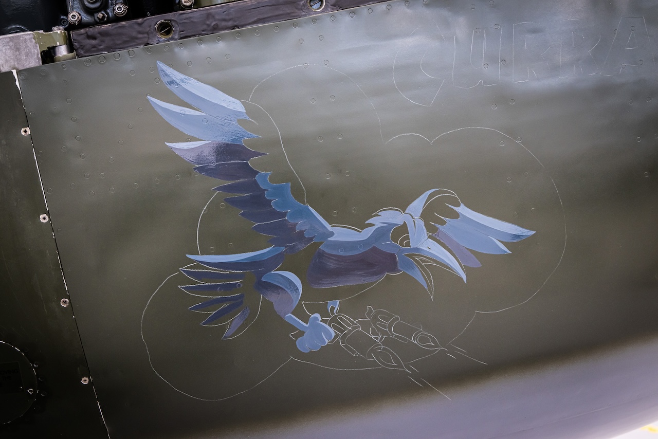 When the aircraft was recovered, all the cowlings from the firewall forward were missing, leaving no trace of its original nose art. However, research revealed that No. 75 Squadron often named its aircraft based on their letter designation, and in this case, “Currawong” was chosen—a nod to the black-and-white Australian magpie featured on the squadron’s patch. The name was retained during the aircraft’s 2000 restoration in New Zealand, as it was both fitting and historically plausible.