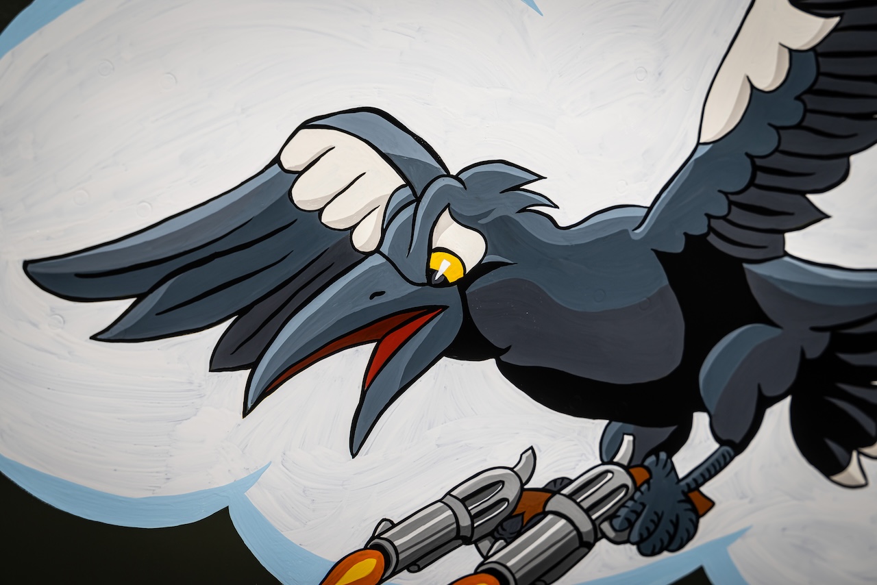 To enhance its authenticity, Chad Hill conducted extensive research on period-correct fonts, colors, and artistic styles. “I wanted it to fit within the squadron’s aesthetic while also appealing to people today,” he explained. Inspired by vintage Disney-style cartoons, the final design features a stylized magpie wielding two six-shooters—symbolizing the P-40’s reputation as a fierce fighter aircraft. The lettering, sourced from a 1941 typeface book, ensures historical accuracy.