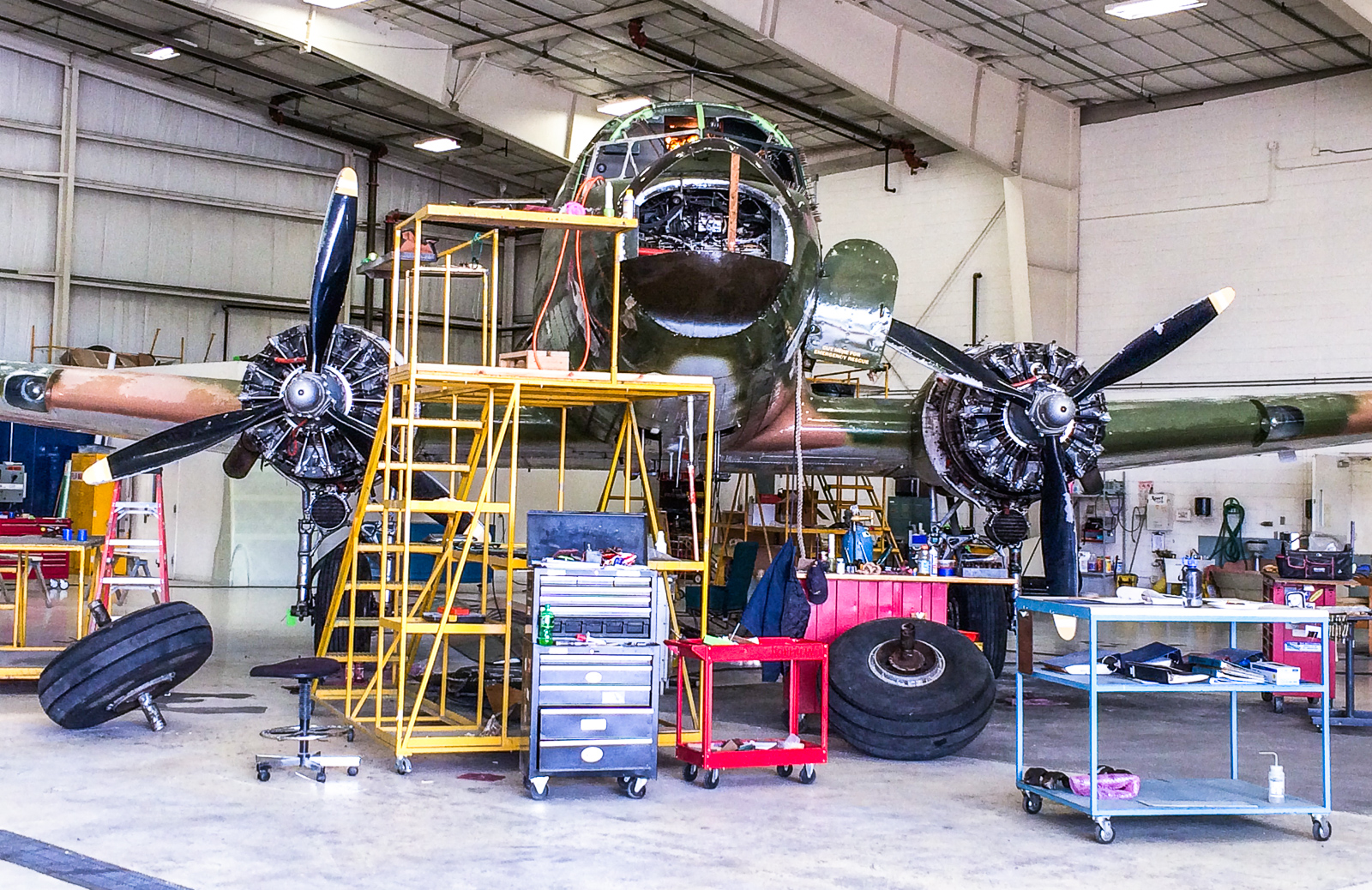 And thanks to Kickstarter, we’ve been able to start work, more than two months ahead of schedule. Last week the airplane was brought into the shop at Basler Turbo Conversions in Oshkosh, WI. A new-old-stock original two-piece windshield is being installed, along with the correct WWII era clamshell nosecone.