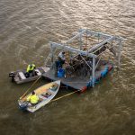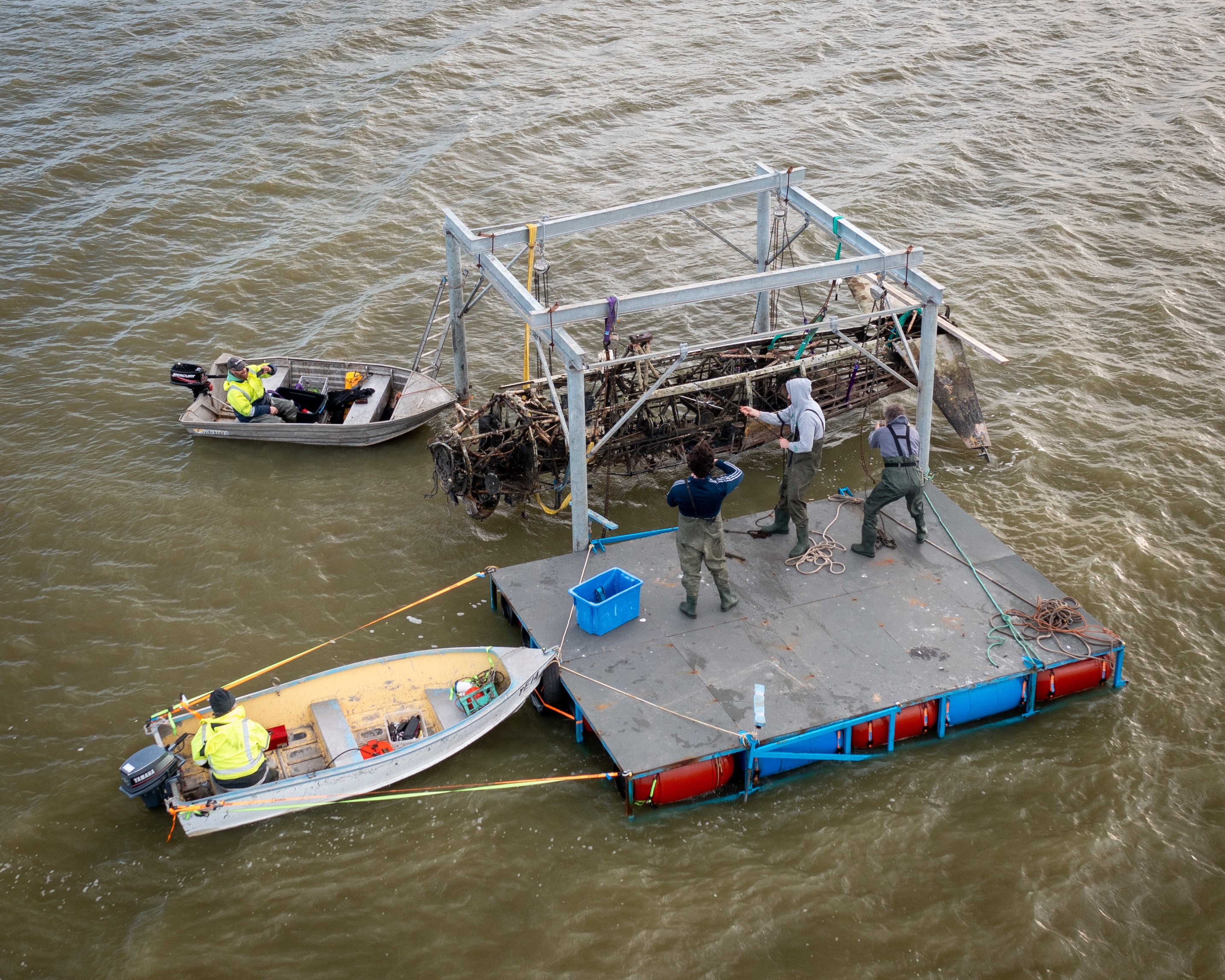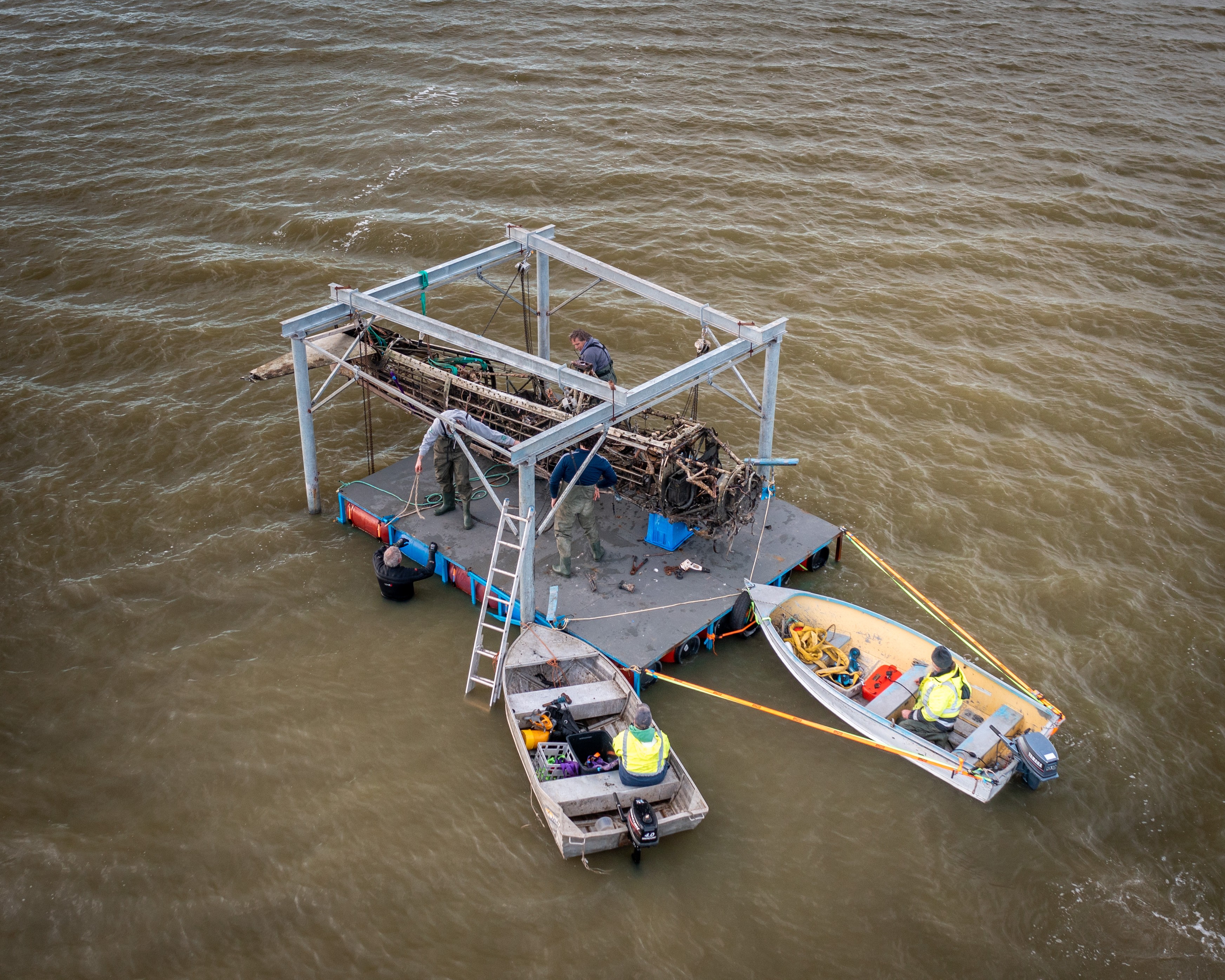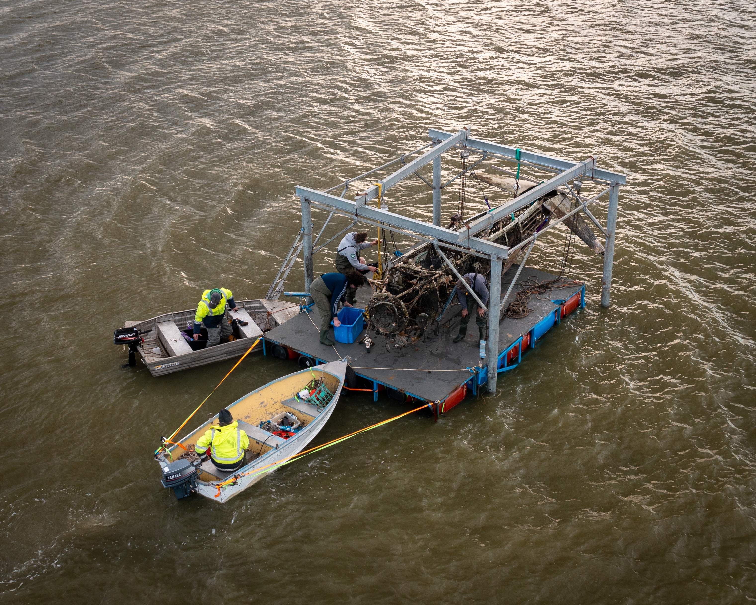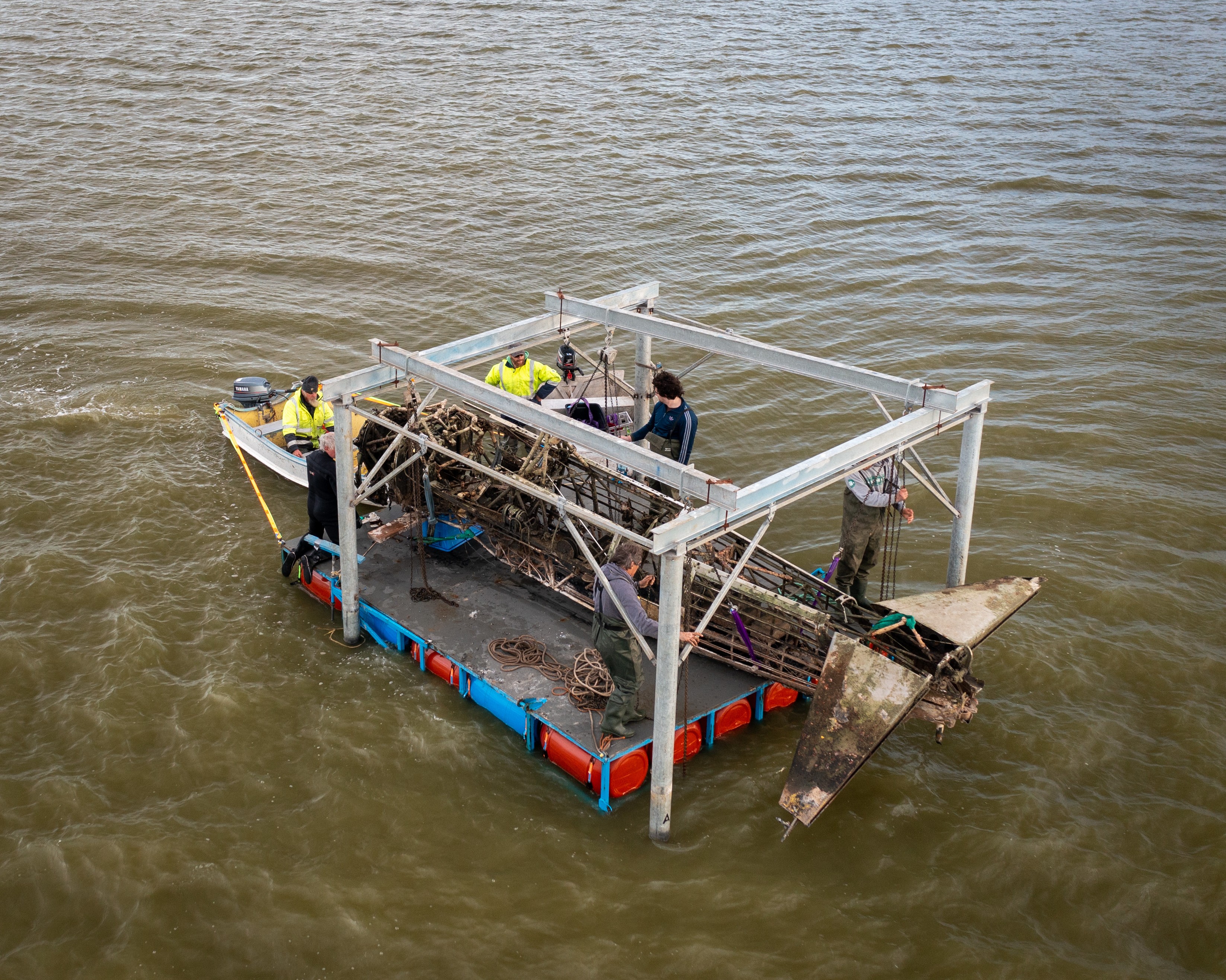 Finally, in August 2021 a window opened for Rod and his team to recover the Wirraway. Early that month, they undertook the first small scale recovery effort, salvaging some test components, such as the elevators, to gain greater understanding for how complex the rest of the recovery process would be. This endeavor persuaded Rod that the airframe was generally intact and salvageable. The next step involved raising the propeller and engine to the surface, which they achieved successfully. Rod and his volunteers then began the next recovery goal, which involved lifting the fuselage using the steel gantry system he had devised. They accomplished this step successfully during the last two weeks of August, 2021. Of course, there were some complications due to wind and the need to remove the bolts holding the fuselage to the centre section, but these didn’t cause too significant a delay. Once the fuselage was raised, the team placed it onto the barge and towed it to shore.