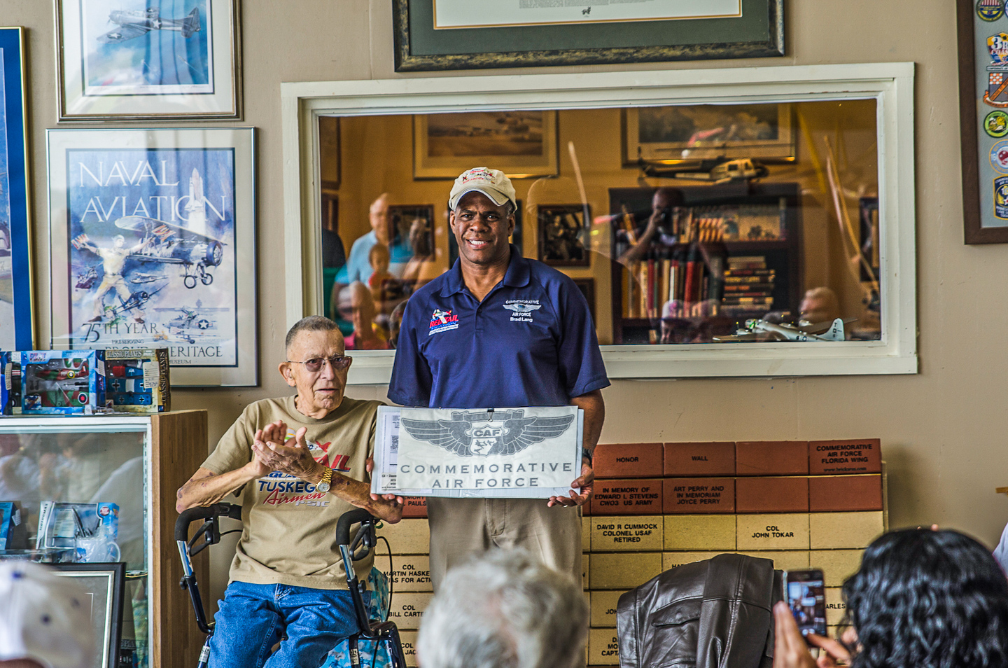 Van Iderstine, a retired businessman and aviation enthusiast from New Smyrna Beach, Fla., watched as the crowd of friends and visitors slowly took their places in front of the Florida Wing’s shiny silver Beechcraft T-34A USAF trainer. Parked nearby was the Red Tail Squadron’s famous P-51C Mustang – the carefully restored and proudly maintained signature aircraft of the Tuskegee Airmen. Van Iderstine has a deep affinity and respect for the Tuskegee Airmen and the events of this day would be the conclusion of a dream that he had held close for so many of his 85 years.