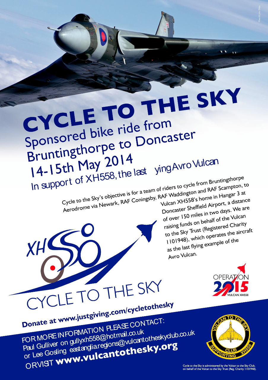 The Vulcan to the Sky Trust, which maintains and operates Avro Vulcan B.2 XH558, is holding a sponsored cycle rideover the weekend of May 14th/15th. “Cycle to the Sky”, as it’s called, will cover over 150 miles. The ride will start at Bruntingthorpe Proving Ground, in Leicestershire and progress to Robin Hood Doncaster Sheffield Airport via Newark Aviation Museum, RAF Coningsby, The Sentry Post (Waddington Aircraft Viewing Enclosure), and RAF Scampton. They hope to raise at least £5580 through the event in support of the Trust, which may not sound a lot considering the requirements of a magnificent beast like the Vulcan, but every bit helps.