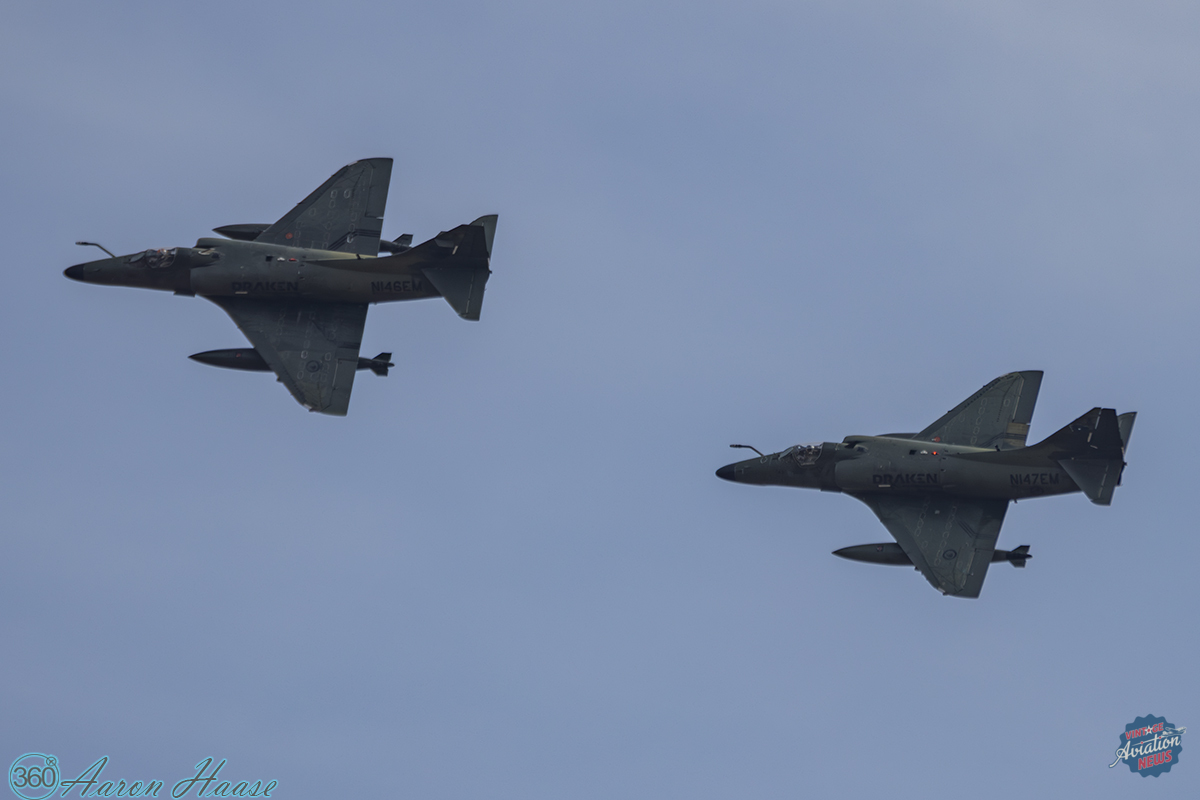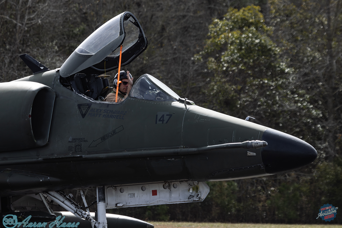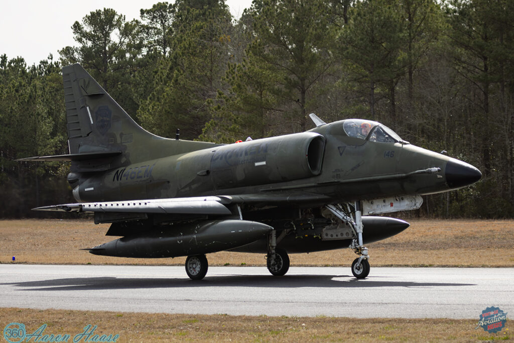 The aircraft participating in the “fight” were F1Ms N564EM and N575EM, and TA-4K N141EM and A-4N N162EM. Once the aircraft were ready, we took a golf cart to the ready area and watched the four aircraft line up for their pre-flight checks. It was really cool to see these four aircraft lined up together. Once ready, they taxied out for takeoff. The F1 has a very cool takeoff sound with a unique low rumble bass to it. Once they departed, two Skyhawks returned back from a sortie out of MCAS Cherry Point, these aircraft being a pair of A-4Ks (N146EM and N147EM). They arrived in a beautiful low fan break overhead into the pattern and taxied right past us to their parking spots.