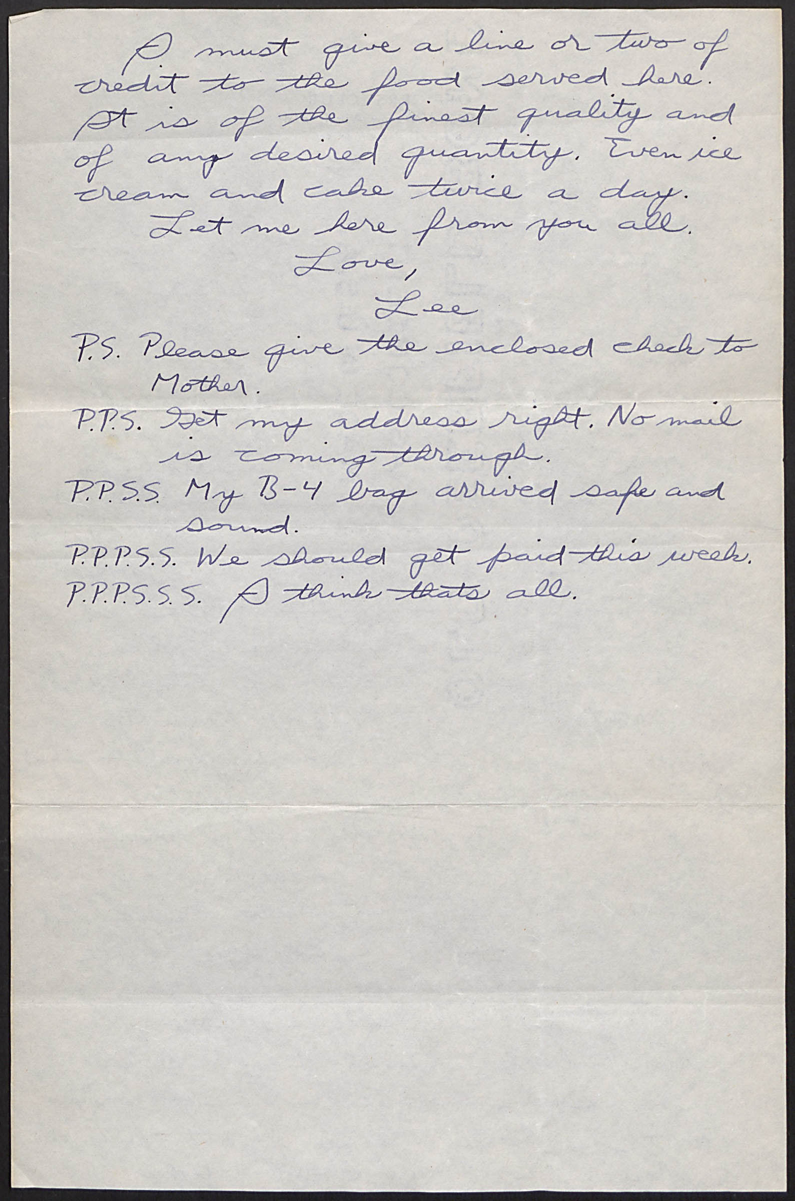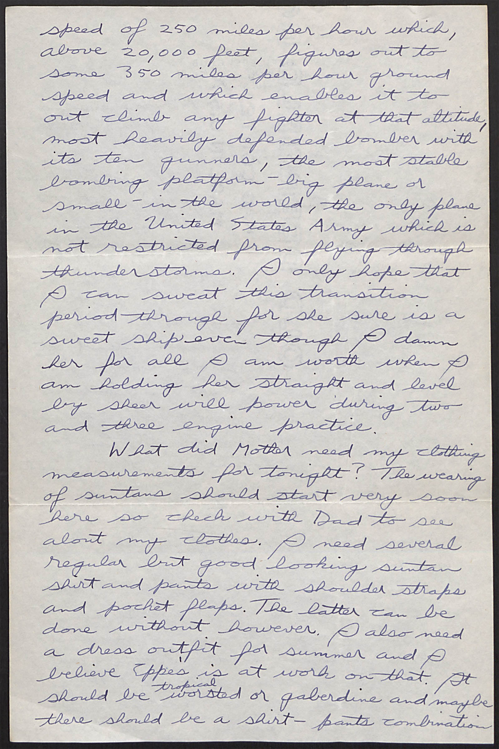Each member of the family wrote detailed letters that gave a glimpse of what life was like from their perspective-either back at home or from the front. Lee’s letters described his training as a B-17 pilot, which included learning to fly the Piper Cub, Stearman, Vultee BT-17, and Cessna AT-17 before his assignment to the B-17. He flew 37 bombing missions to Germany with the 8th Air Force from Rattlesden AAF Base in Suffolk, England. Letters from home in Wilmington offered hometown news, encouragement, and guidance from his parents or jokes and lighter news from his teenaged sisters. Taken together, the correspondence provides researchers an unusually complete picture of one family’s experience during World War II.