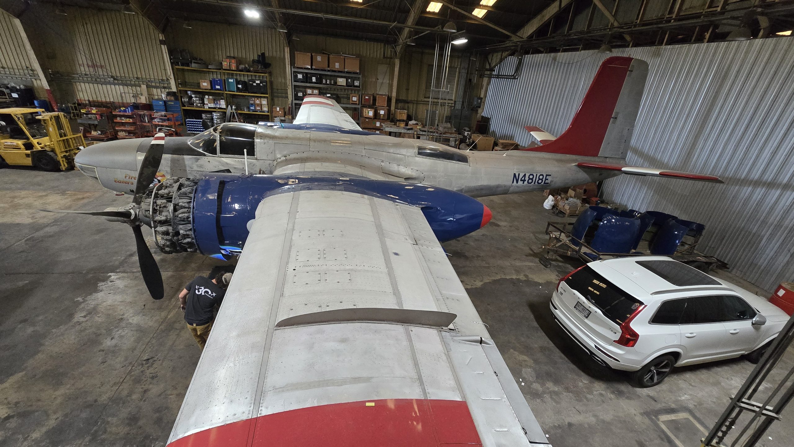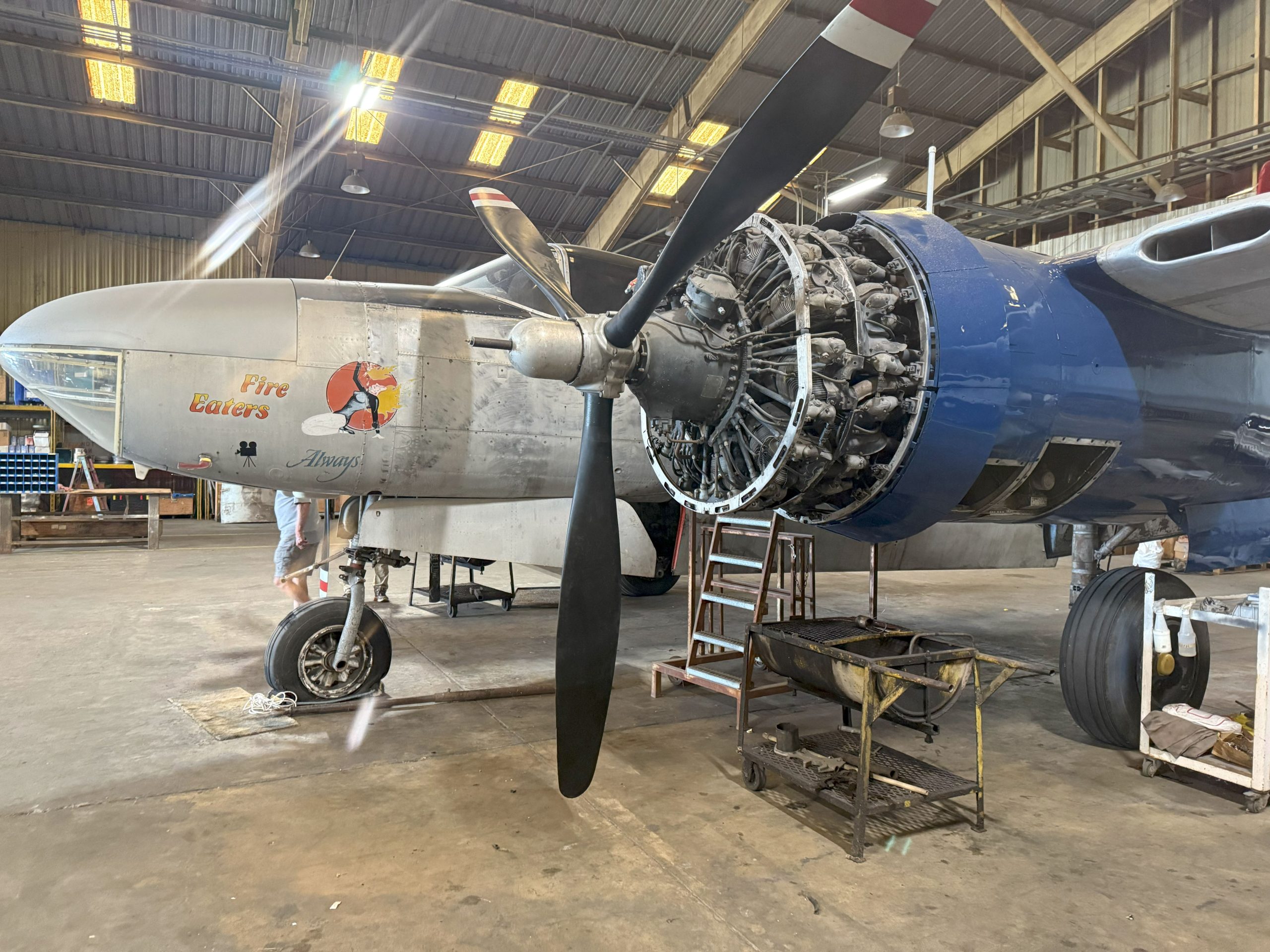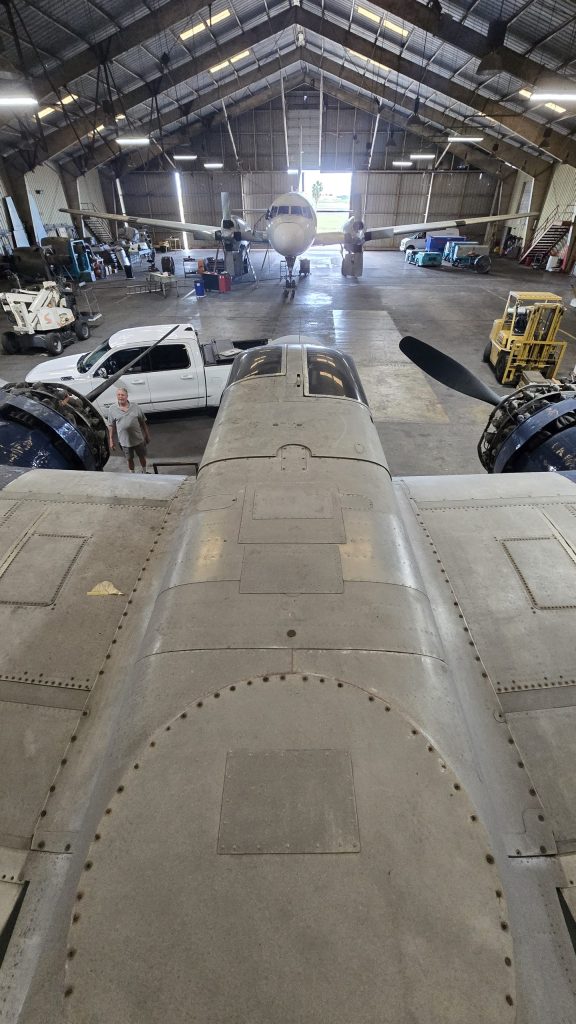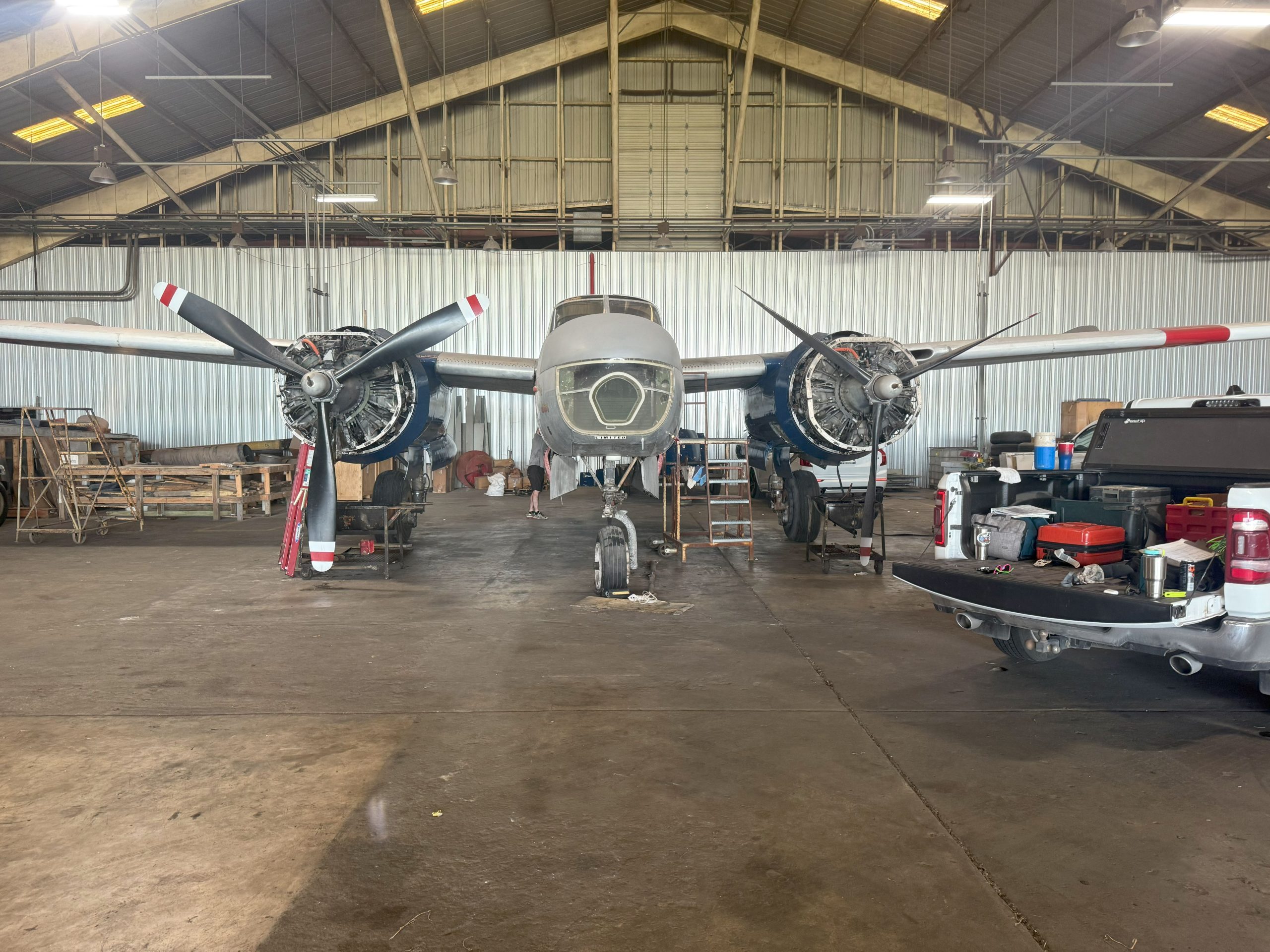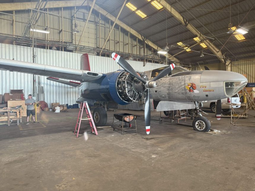 After being acquired from Rock Island by Consolidated Air Parts Corp. of Los Angeles, N4818E was acquired by Danny Lynch, the founder of Lynch Air Tankers of Billings, MT. Lynch used surplus Invaders as fire tankers to assist the Forestry Service in putting out forest fires throughout the northern Rockies, adding 1,200-gallon tanks in the bomb bay for fire retardant chemicals. However, Lynch and his pilots noted that the takeoff and landing characteristics operating out of “hot and high” airfields (airfields at high elevation with heat from the massive fires all round) requiring modifications to the aircraft designed to fly at high speeds and often at high altitudes during WWII. The solution resulted in the Lynch STOL 26 modification, which drastically improved the already versatile Invader’s short takeoff and landing (STOL) capabilities, a crucial feature for short runways in the high elevations of Montana and Idaho. Lynch installed a leading-edge cuff on the wings, four wing fences across the span of the wing, and slats near the wing tips to improve lateral control.