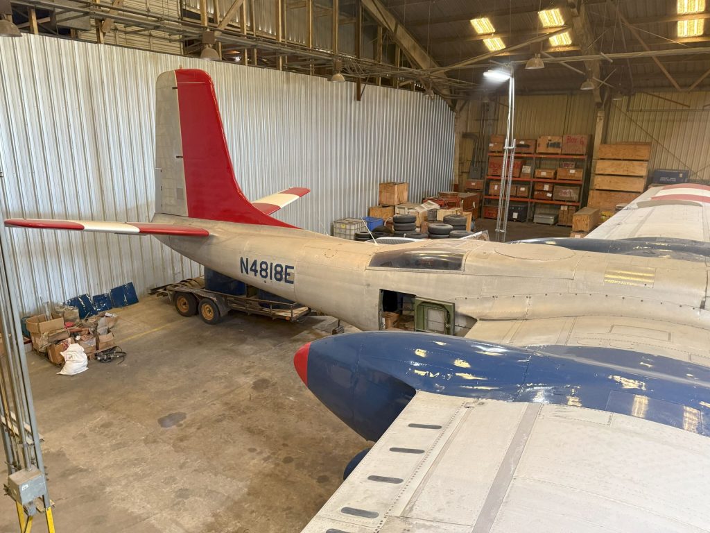 N4818E was built in Douglas Aircraft, Tulsa, OK plant as an A-26C with the construction number 28650 and was delivered to the US Army Air Force as 44-35371. The aircraft was converted to become a TB-26C trainer variant of the Invader, where it was assigned to the 3201st Air Base Wing, Air Proving Ground Command, Eglin AFB, FL. After its time in the Air Force as an unarmed trainer, it was declared surplus and was acquired by Rock Island Oil & Refining Co. of Wichita, KS and registered with the FAA as N4818E. The company had planned to convert the Invader into a Monarch 26 executive transport, which would have lengthened the nose and added an executive cabin to the gunner’s compartment. However, the conversion was not carried out for N4818E and was stored at Hutchinson until 1966.