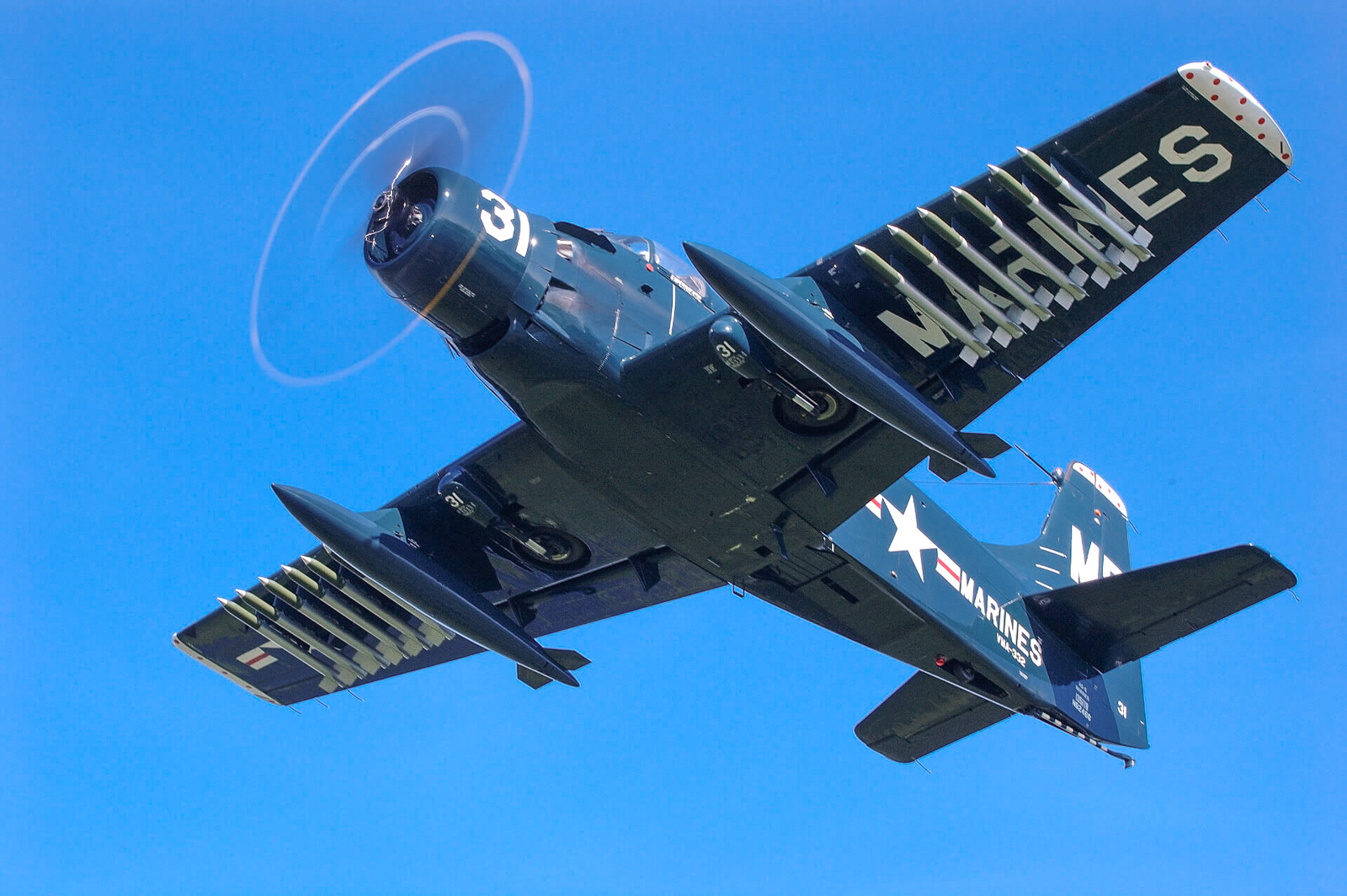 When the U.S. military unified its aircraft designation nomenclature during the fall of 1962, the Skyraiders still on the books with the U.S.Navy or Marine Corps officially became A-1s. More specifically, the AD-5W variant gained the new designator, EA-1E. While we presently don’t have details about the early part of BuNo.135178’s military career, we do know that by 1964 she was serving with VAW-11 aboard USS Kearsarge. The aircraft would have appeared much like the Skyraider depicted in the image above. By 1969, having undergone modifications which saw the removal of its radar suite (and radome) the Skyraider was serving with the Naval Aerospace Medical Institute at Naval Air Station (NAS) Pensacola in Florida, although precisely what her role was there is unclear at present. The U.S. Navy formally struck the airframe from their books on June 17th, 1971, transferring it the following day to the nascent U.S. Marine Corps Aviation Museum, then gathering exhibits in a small hangar at Marine Corps Air Station (MCAS) Quantico in Quantico, Virginia. However, since this particular Skyraider did not have a strong connection to the ‘Corps’, they passed her on to the legendary warbird collector Doug Champlin in 1974. Champlin placed the aircraft on the U.S. civil register for the first time soon after, listing her as N62466. John Downing acquired the Skyraider from Champlin during the following year, and he in turn sold it on to Don Hedrick the year after that. This aircraft has been through several further owners in the interim, and appeared fairly regularly on the air show circuit, initially in her original NAS Pensacola colors but, by 1990, the aircraft had gained its present U.S. Marine Corps markings.