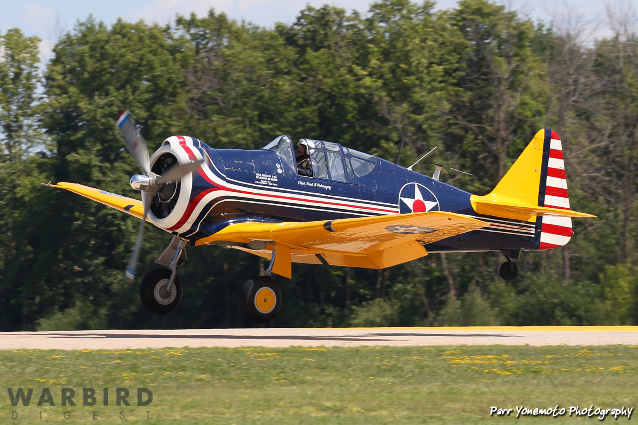 The EAA Museum’s unique North American P-64 coming in to land at EAA AirVenture Oshkosh 2019. (photo by Parr Yonemoto)