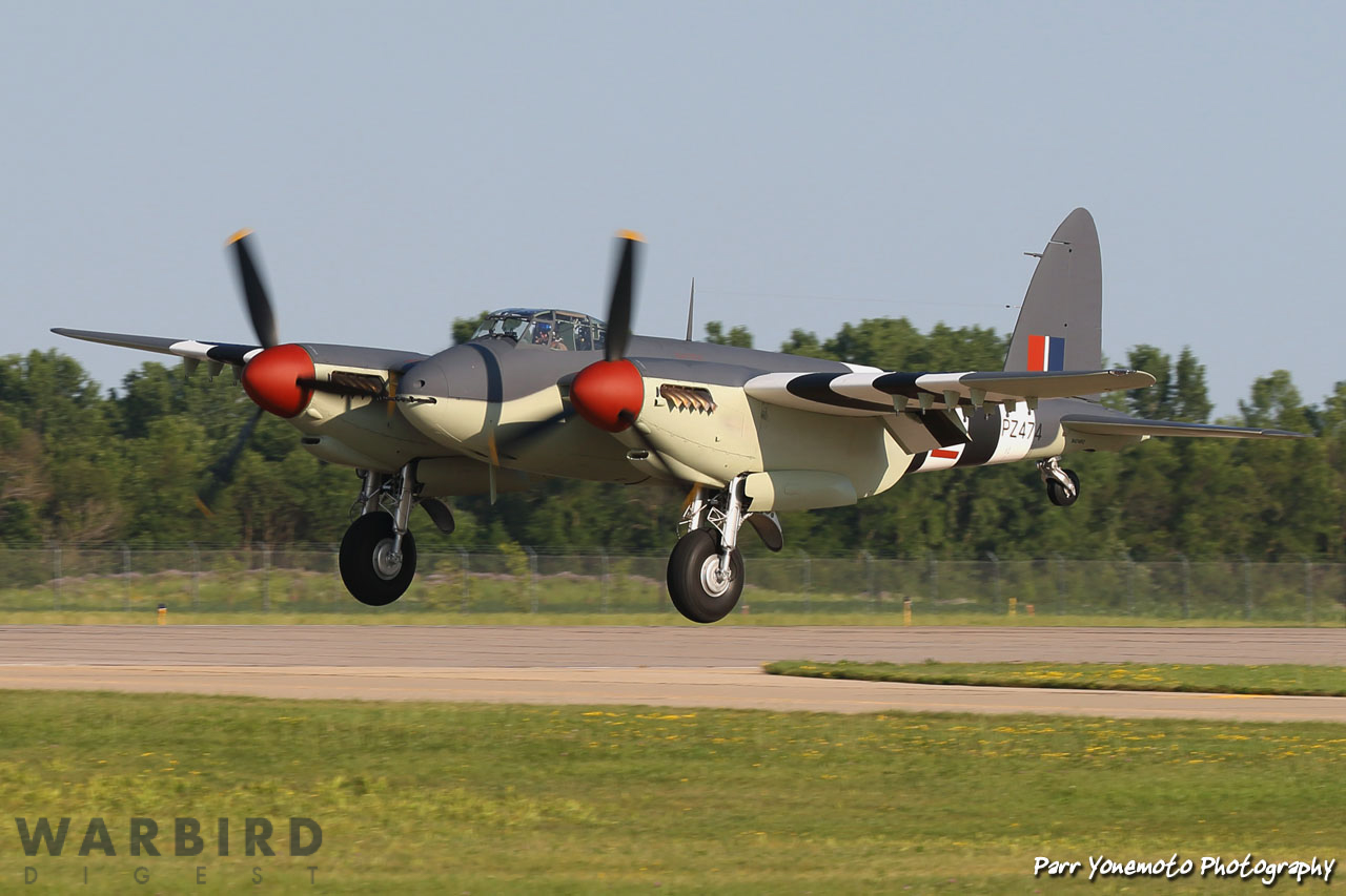Rod Lewis’s superb de Havilland Mosquito FB.VI PZ474 arriving at EAA AirVenture Oshkosh 2019. This aircraft flew with the Royal New Zealand Air Force as NZ2384. AVSpecs Ltd. restored her back to flying condition at their shop in Ardmore, New Zealand. She made her first post-restoration flight on January 13th this year. (photo by George Land)