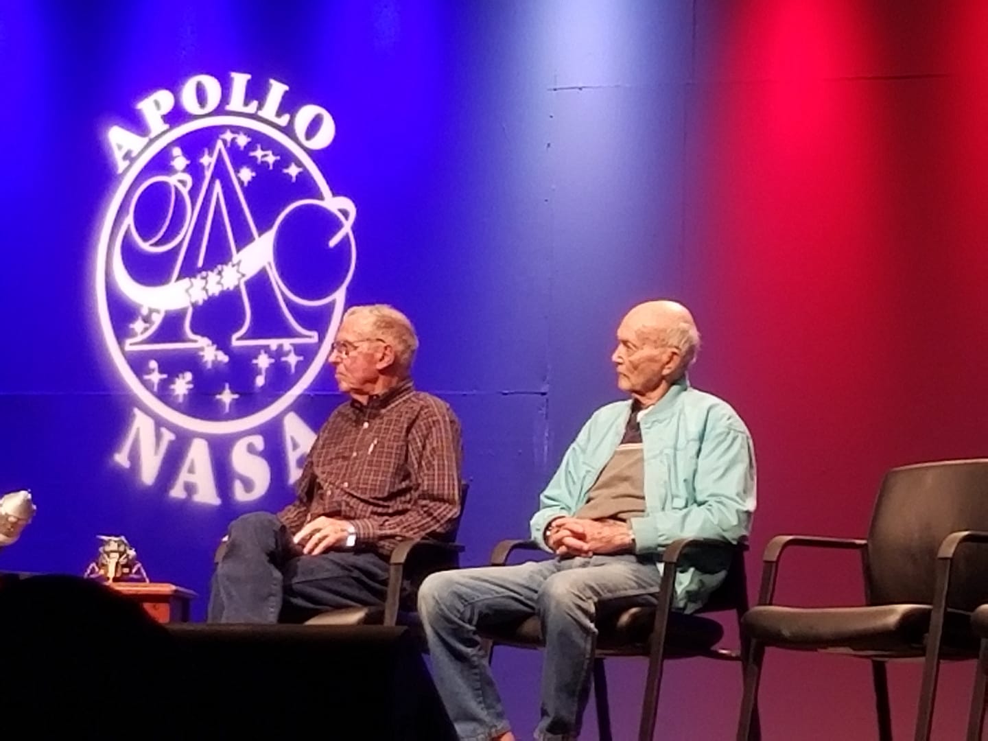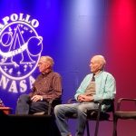 Former astronaut Michael Collins (R) spoke at EAA in Oshkosh. Collins was the command module pilot on the Apollo 11 mission on July 20, 1969. July 26, 2019. was the commander of two Space Shuttle missions including STS-2, the program’s second orbital flight. He also participated in the Shuttle program’s Approach and Landing Tests. Engle is one of twelve pilots who flew the North American X-15, an experimental spaceplane jointly operated by the Air Force and NASA. Photo by Amanda Hobson