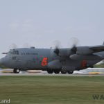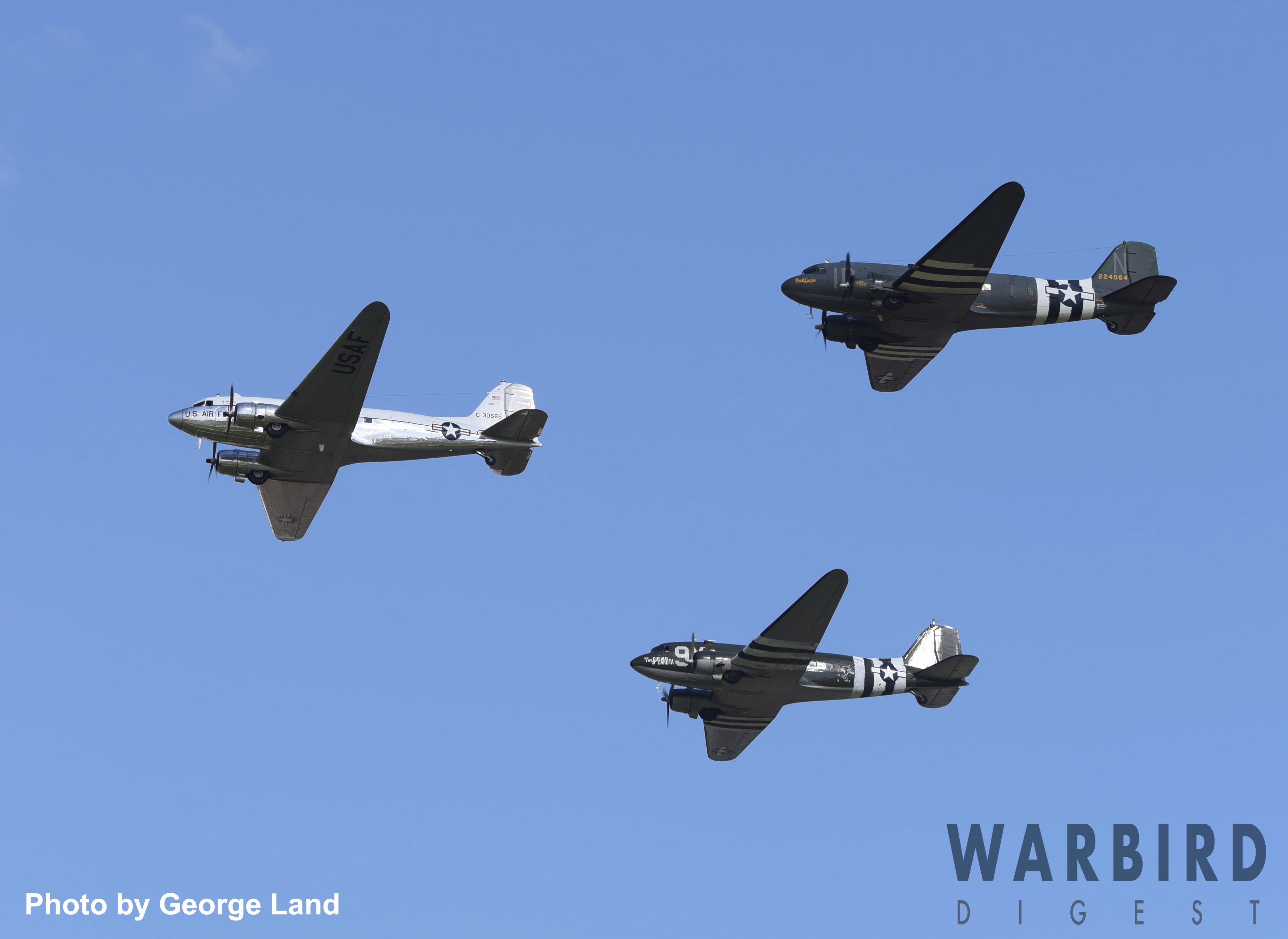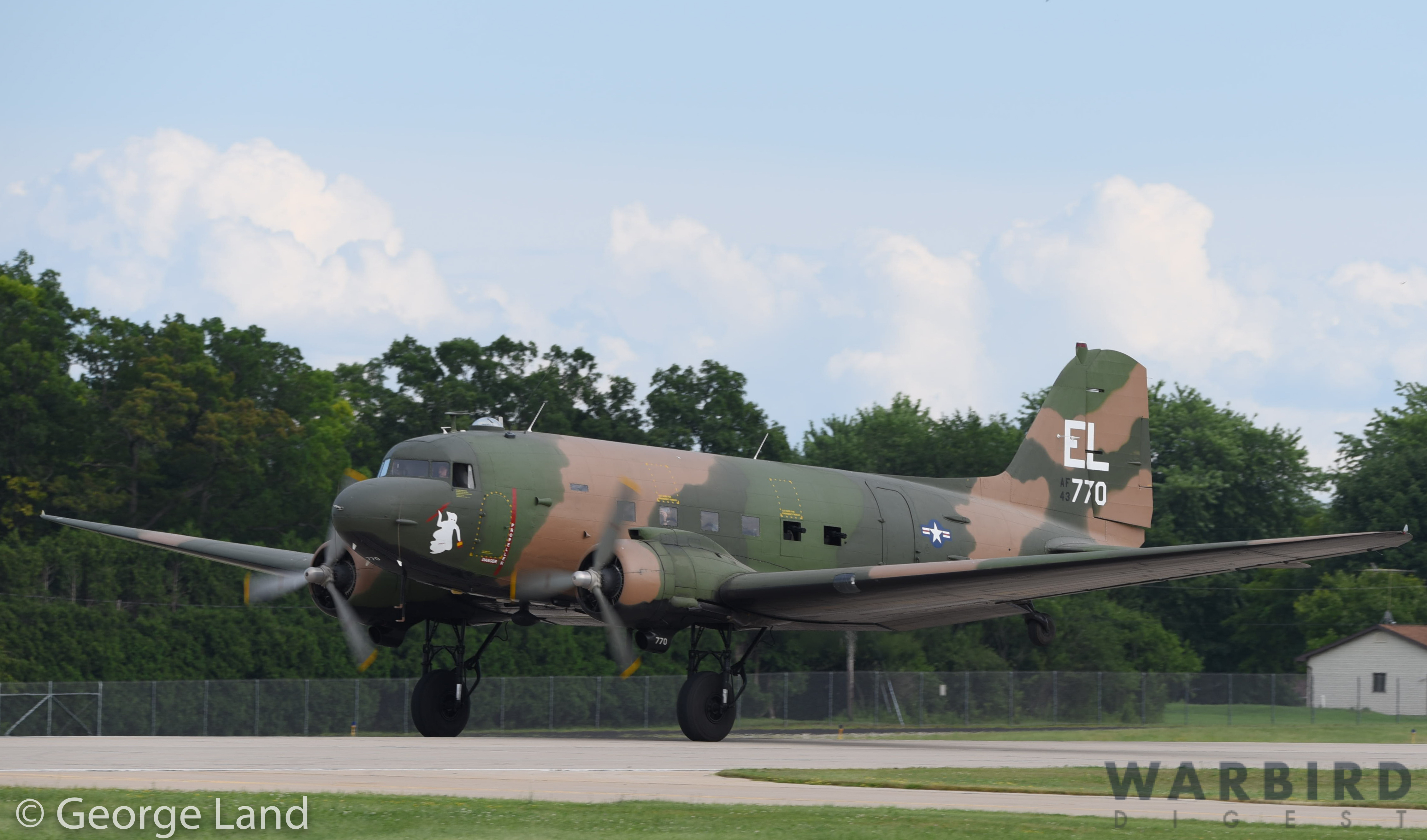 Douglas C-47B Skytrain 43-16369. This aircraft served with the legendary 436th Troop Carrier Group in Europe during WWII, but arrived in Septemver, 1944, too late to take part in the D-Day invasion. Currently, the aircraft is based with the American Flight Museum, Forbes AFB, Topeka, KS operated as an AC-47D Spooky gun ship, representing an aircraft which saw service during the Vietnam War, and in which Airman 1st Class John L. Levitow saved the lives of his crew. With his aircraft badly damaged, and himself suffering from grievous wounds, Levitow jumped upon a burning flare as it rolled around on the fuslage floor having been knocked from a fellow crewman’s hands on a night-time mission… Levitow managed to crawl with the flare under his chest and throw it clear of the airplane before it fully ignited, thus saving himself and his crew. For his bravery and self sacrifice, Levitow received the Medal of Honor. (photo by George Land)