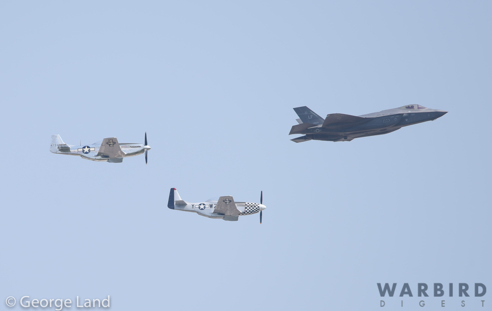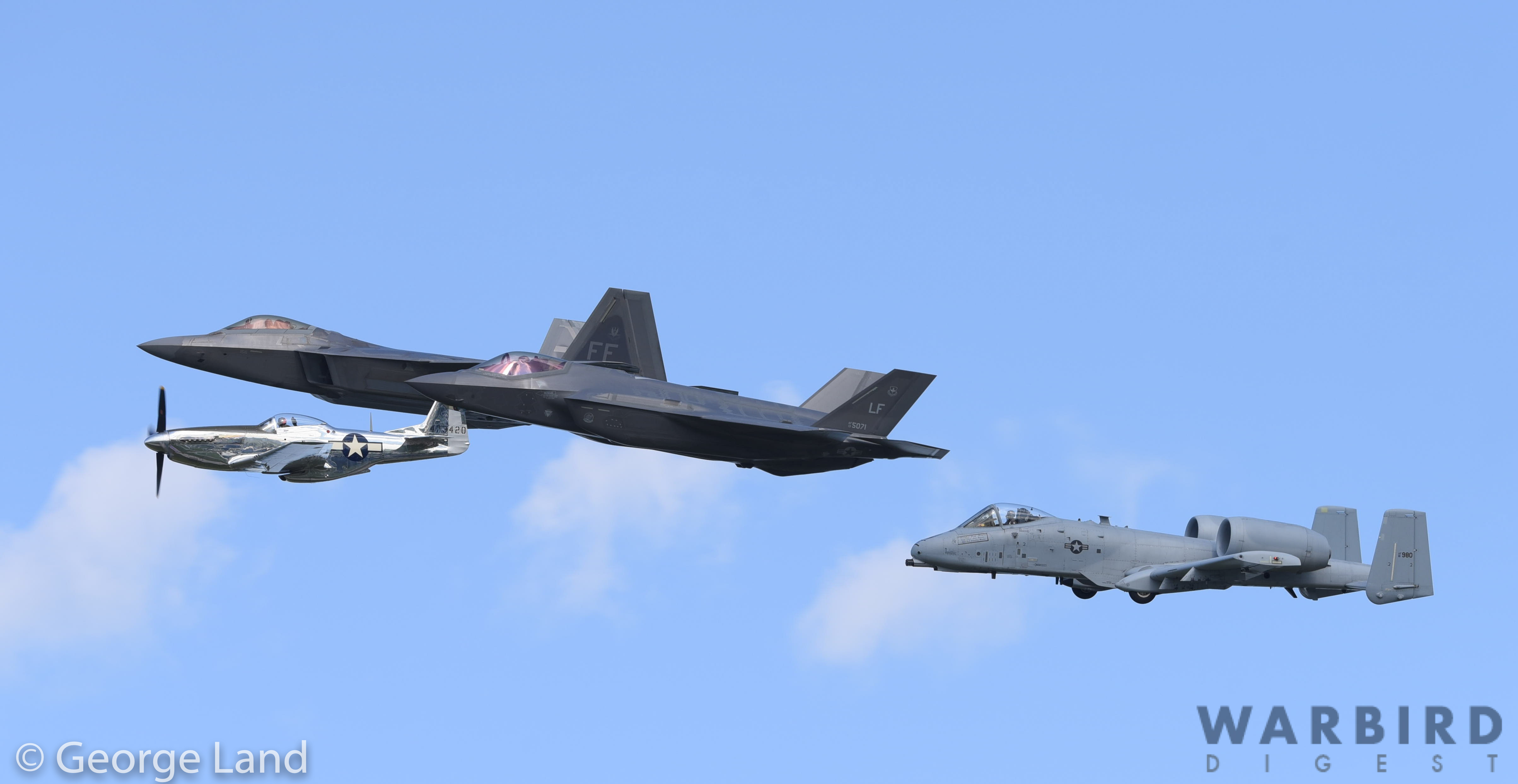 A marvelous U.S. Air Force Heritage Flight featuring Andrew McKenna’s beautifully restored P-51D Mustang 44-73420 in formation with an F-22 Raptor, F-35 Lightning II and an A-10… an unusual formation which is likely in its first season! (photo by George Land)