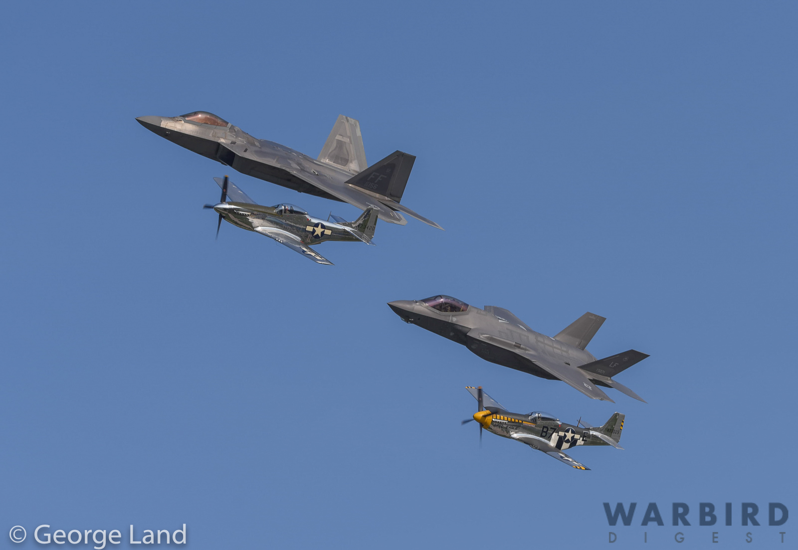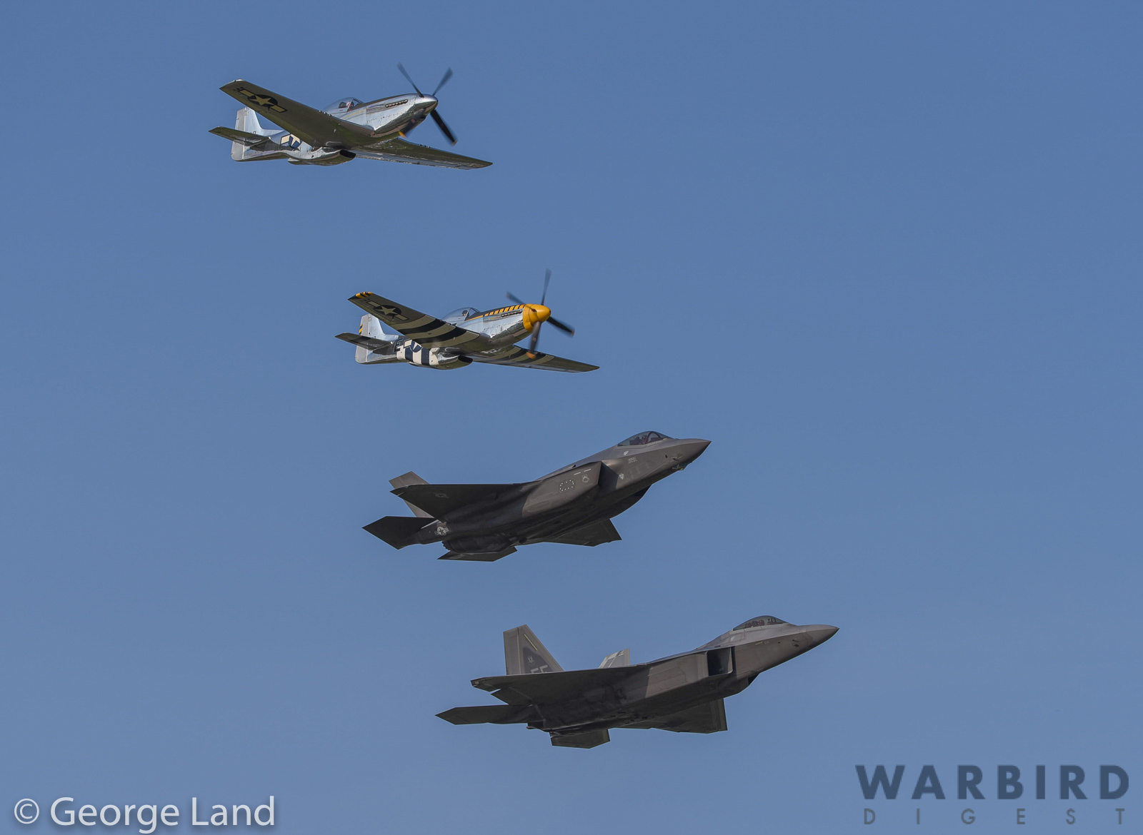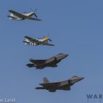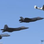 A fabulous photo of another USAF Heritage Flight with three Mustangs (Andrew McKenna’s P-51D 44-73420, Tom Friedkin’s TF-51D 67-14866 and the Cavanaugh Flight Museum’s P-51D 44-72339 ‘The Bratt III’) and an F-22 Raptor (1st FW Langley AFB). (photo by George Land)