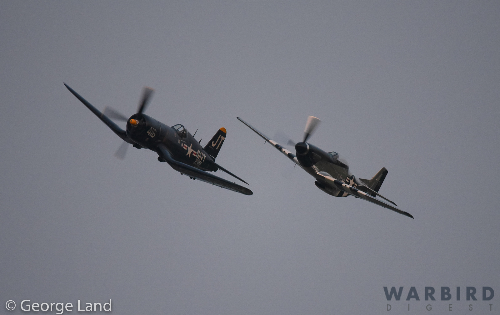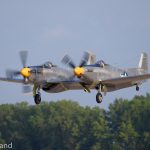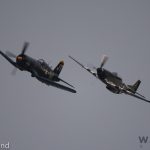 Jim Tobul’s Vought F4U-4 Corsair Bu. 97143 ‘Korean War Hero’ flying alongside Scott Yoak’s P-51D Mustang 45-11439 Quicksilver during a twilight performance at AirVenture. (photo by George Land)