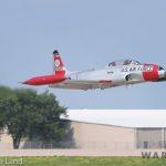 A former Royal Canadian Air Force CT-133 Silverstar (RCAF 21556) painted up to represent American-built T-33 Shooting Star 56-0556… seen here soon after takeoff, with the gear buttoned up. (photo by George Land)