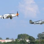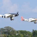 Painted in the markings worn by P-51s flown by the legendary triple ace, Col. Clarence ‘Bud’ Anderson, these two Mustangs take off in formation together at the beginning of the flight in the WWII pilot’s honor. (photo by George Land)