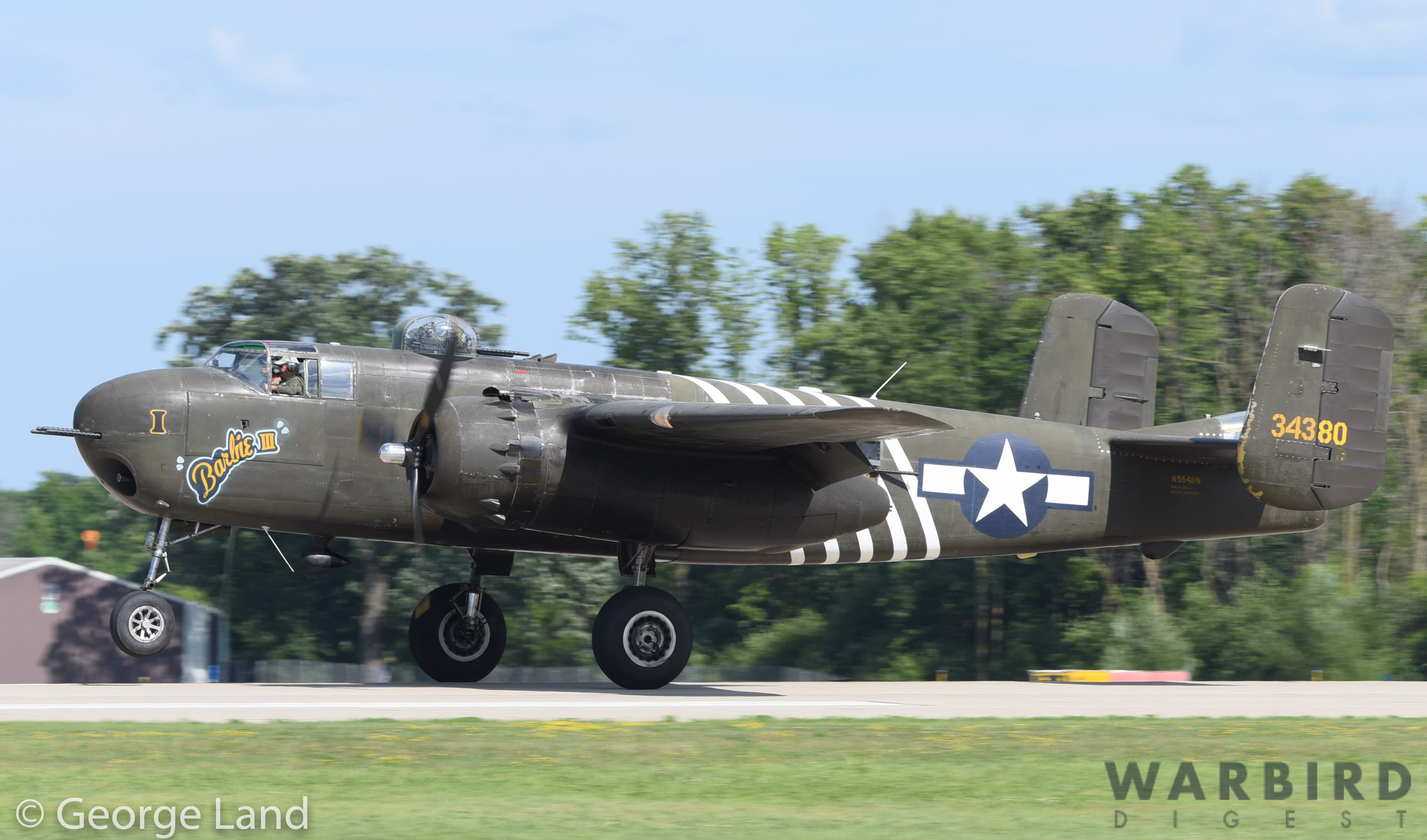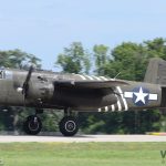 B-25H Mitchell 43-4106 Barbie III touching down at AirVenture Oshkosh 2019. This super-rare H-model variant sports a replica 75mm canon in the nose, and is based with the Cavanaugh Flight Museum in Addison, Texas. (photo by George Land)