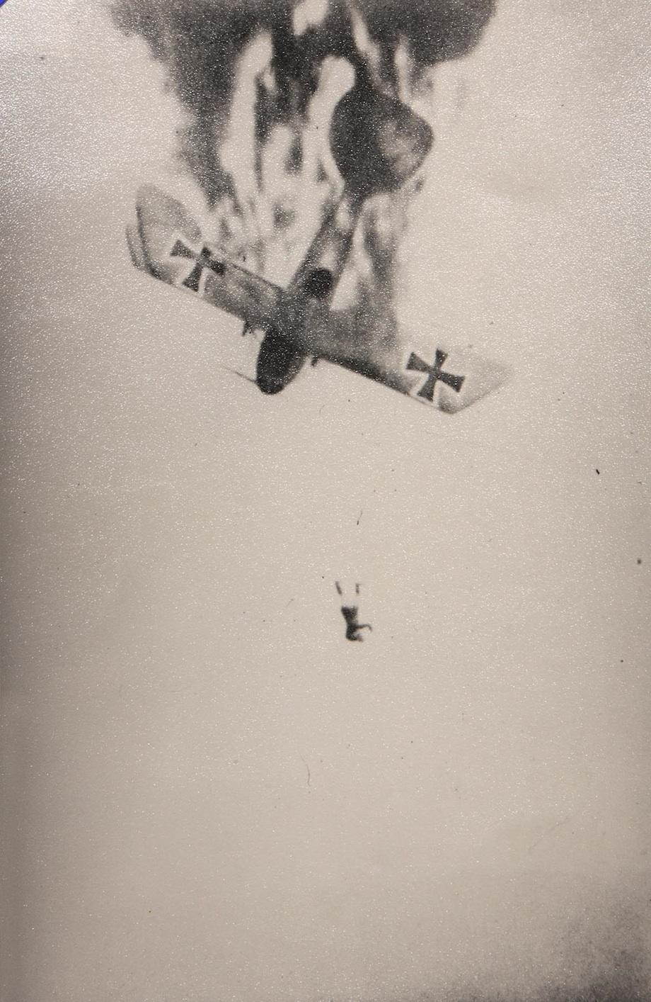 German pilot bails from his stricken plane (Image Credit: Noble Numismatics)Ignoring the long exposure times that cameras of the ‘teens required to get an exposure, “Mrs. Cockburne-Lange” claimed that her husband had mounted a camera on his plane, with the shutter triggered by the trigger on his machine gun. The resultant dramatic photos provided a unique look at German and British planes engaged in dogfights, planes afire and pilots bailing out of their stricken craft.
