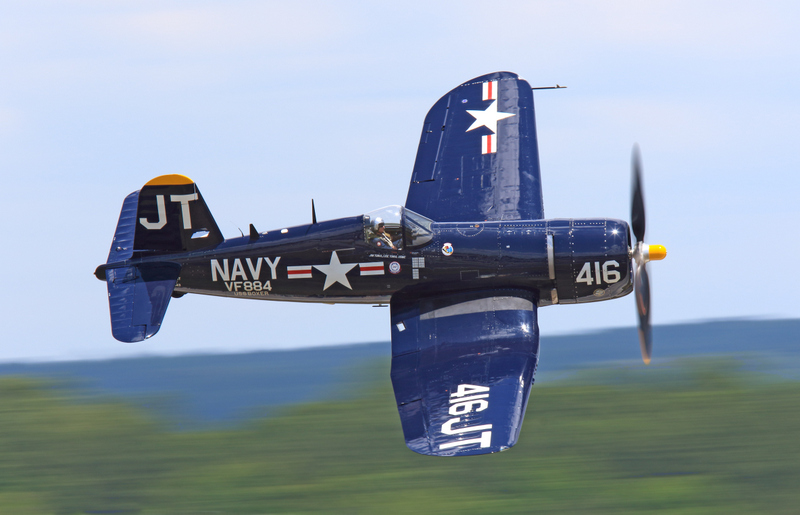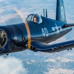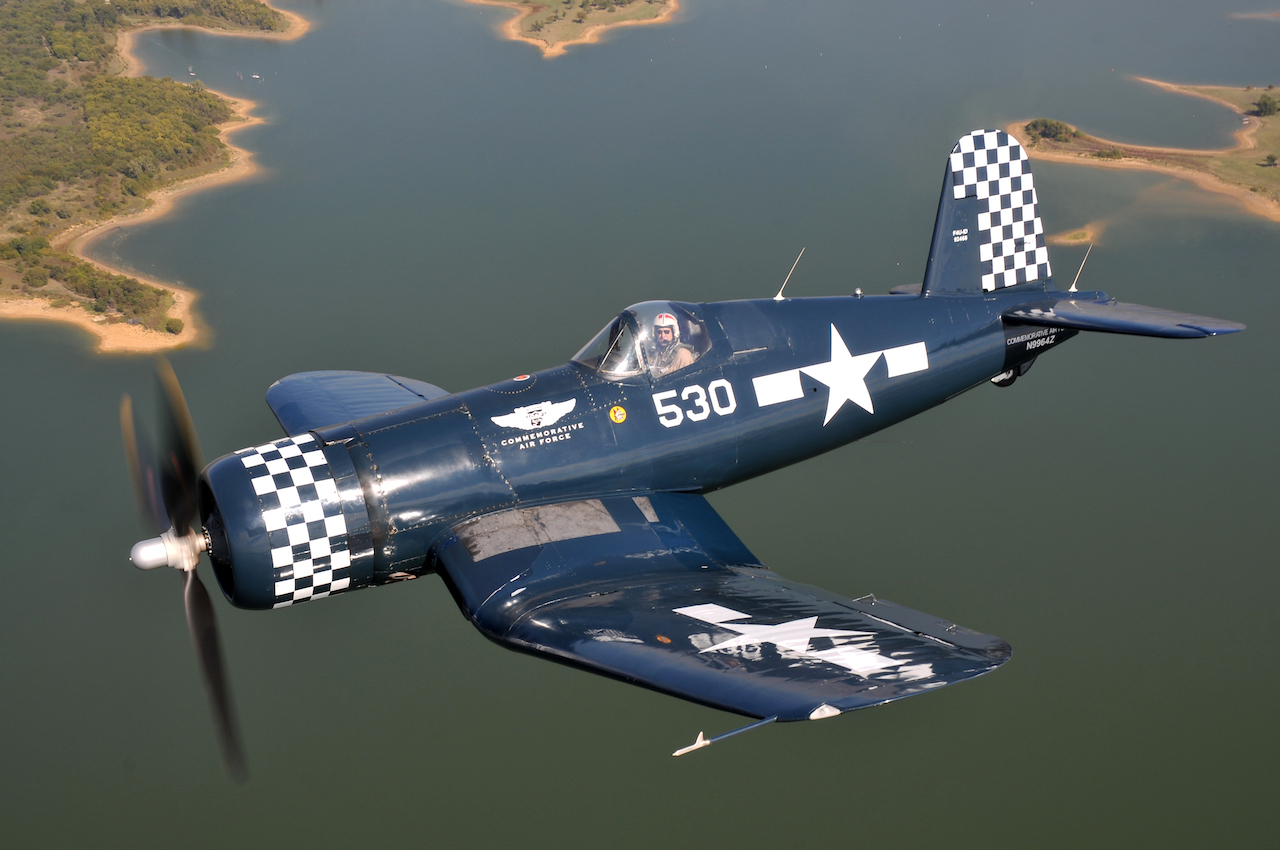 John Fuentes flying the Military Aviation Museum’s FG-1D Corsair. (photo by Richard Mallory Allnutt)