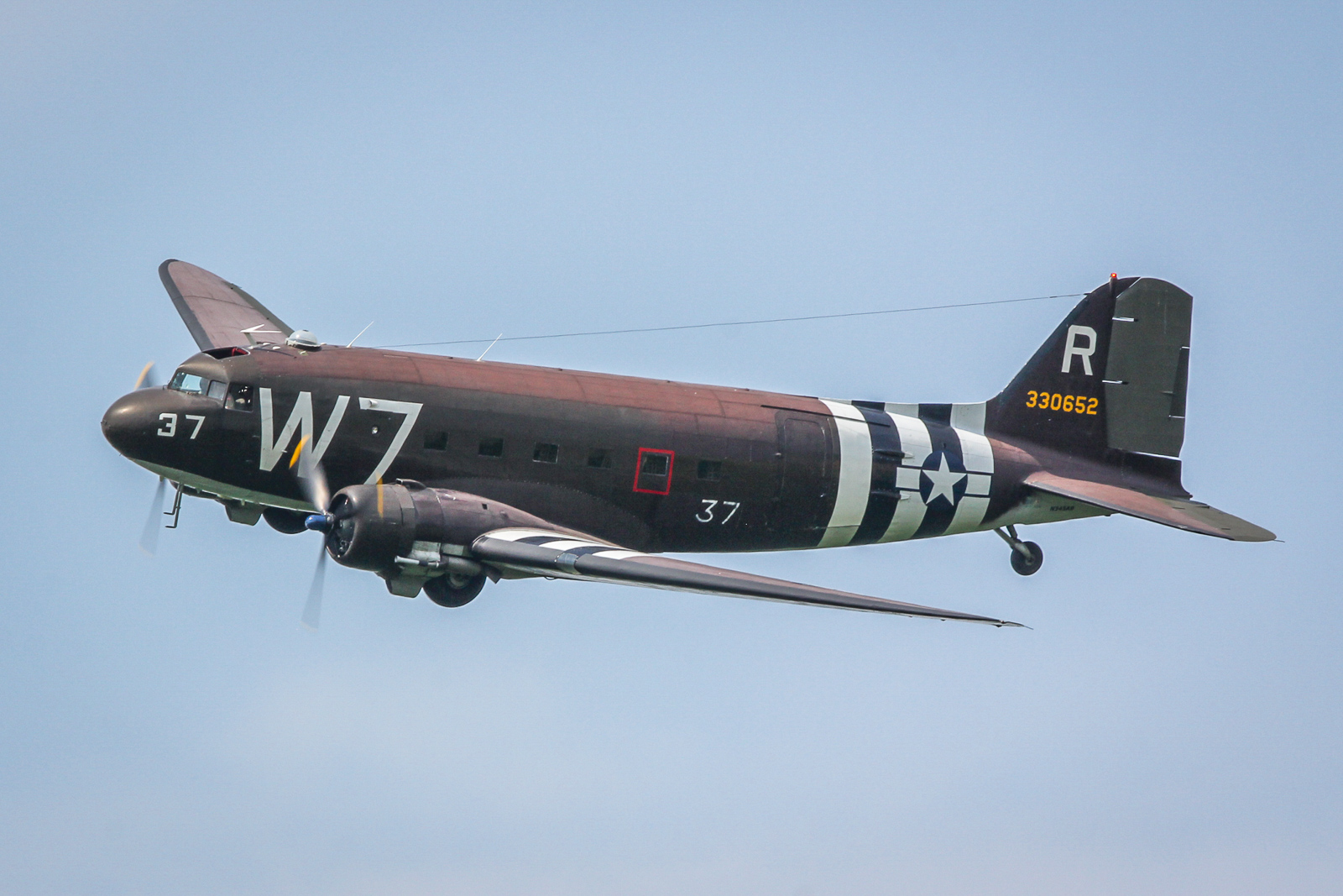 Other aircraft entertaining the audience at Geneseo included B-25’s ‘Miss Hap‘, ‘Take-off Time‘ and ‘Panchito‘. Numerous T-6 Texans and Stearman biplanes, BT-13 Valiants and other trainers and liaison aircraft did fly-bys. TBM Avenger ‘She’s the Boss‘ with Charlie Lynch at the helm simulated the war in the Pacific alongside Ken Laird in a Japanese Val replica and B-25’s… accompanied of course by suitably fierce pyrotechnic explosions on the ground! The National Warplane Museum’s D-Day veteran Douglas C-47 ‘Whiskey 7‘, flown by Chris Polhemus and John Lindsay, was also on hand making parachute drops, fly-bys and offering rides after the show. Incredibly, the DC-3 ‘Flabob Express’ flew all the way from California for the show. Many other vintage civil and military aircraft were also on static display.