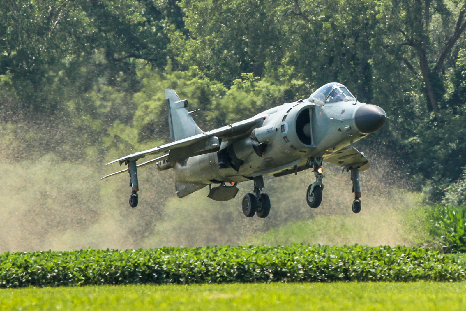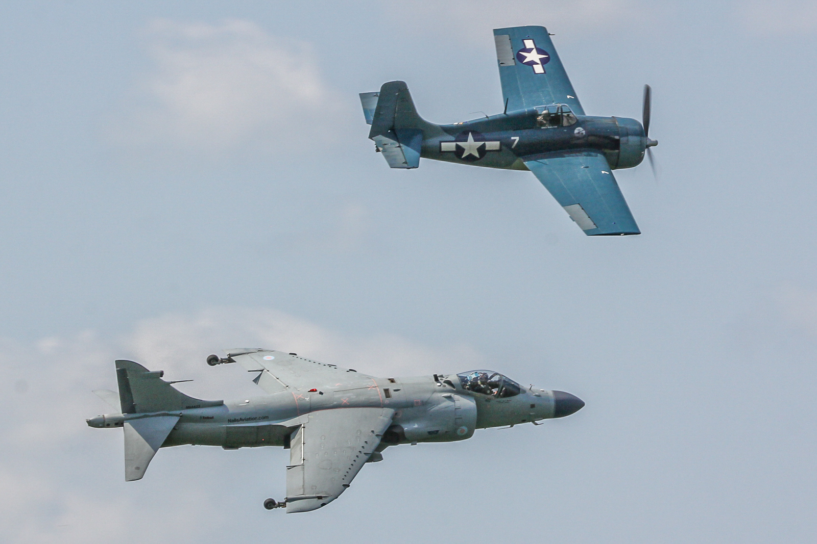Mark ‘Crunchy’ Burgess raced over the corn fields in the Warrior Aviation L-39C Albatross and Art Nalls performed his unique routine in the only privately owned, airworthy Sea Harrier. Although the L-39 operated out of Rochester airport, Art Nalls flew his ‘SHAR’ from the grass strip at Geneseo and made some impressive take offs and landings with the downward-pointing exhaust nozzles on his jet fighter tossing dust and grass every which way. Art Nalls in his Sea Harrier with Greg Shelton in the Wildcat also teamed up for a Marine Corps Heritage Flight as well.