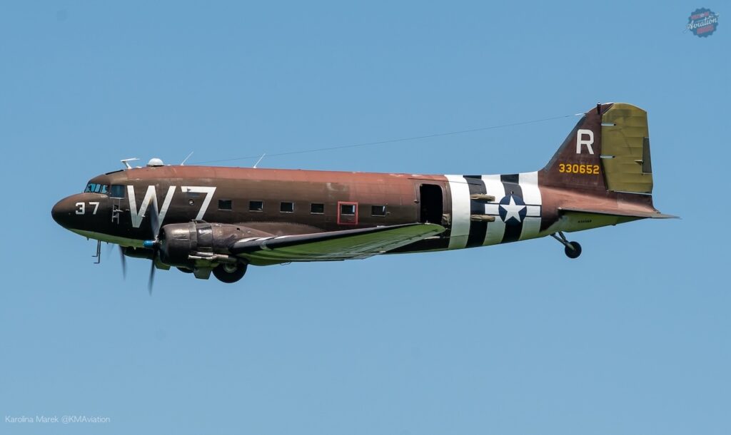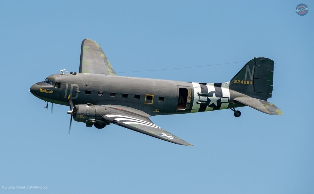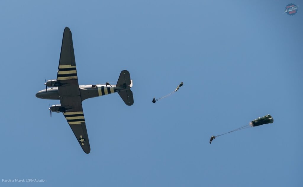 This year, the show was headlined by the F-22 Demo team, Scott “Scooter” Yoak’s North American P-51D Mustang Quicksilver, the P-40 American Dream, and many more wonderful acts that came together to put on one of the best airshows of this season. One of the most memorable acts of the show was the D-Day 80 Normandy reenactment. There were two Douglas C-47 Dakotas on site, the NWM’s own Whiskey 7 and Placid Lassie — another D-Day veteran — from the Tunison Foundation. The Round Canopy Parachuting Team was onsite as well and ready to put on a great tribute to our fallen heroes by jumping from the aircraft the same way our men did 80 years ago.