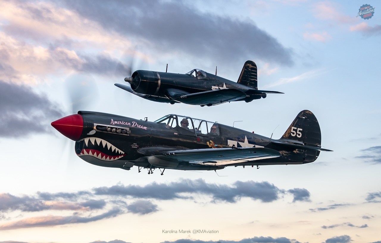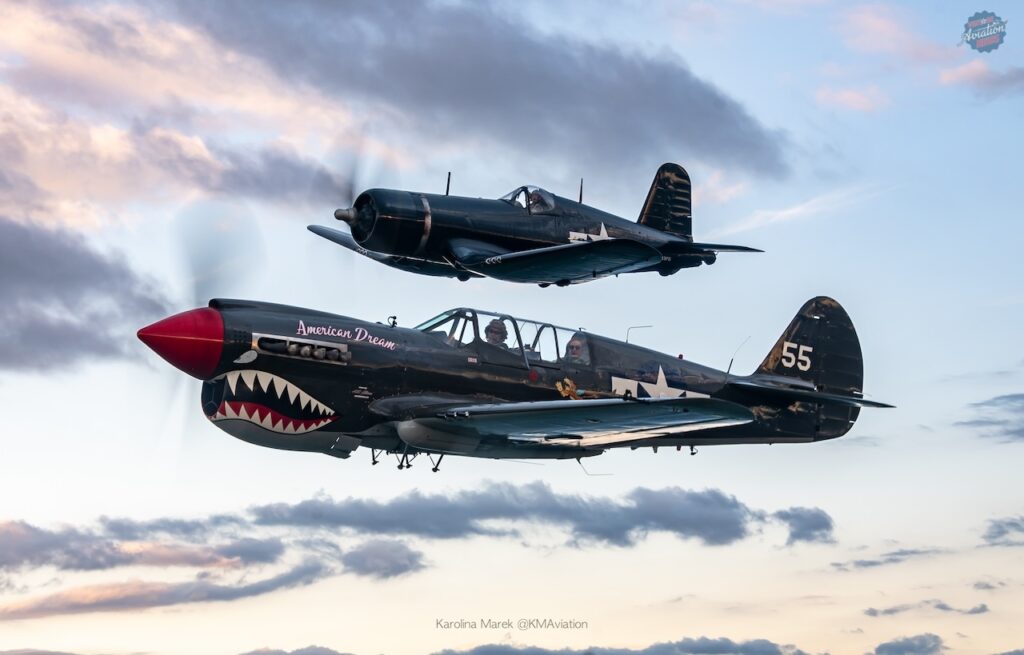 Once in the air, pilots Peter Treichler and Ruben Alconero invited passengers into the cockpit and allowed everyone to get a better look at the flight instruments while enjoying the great views. Later in the flight, Louis Horschel in his Goodyear FG-1D Corsair, Thom Richard in his Curtiss TP-40N Warhawk American Dream, and Rob Holland in his MXS-RH joined up with W7 and flew in a pristine formation allowing for great air-to-air images of their aircraft. The day concluded with a wonderful sunset, which led to more golden hour photo opportunities.