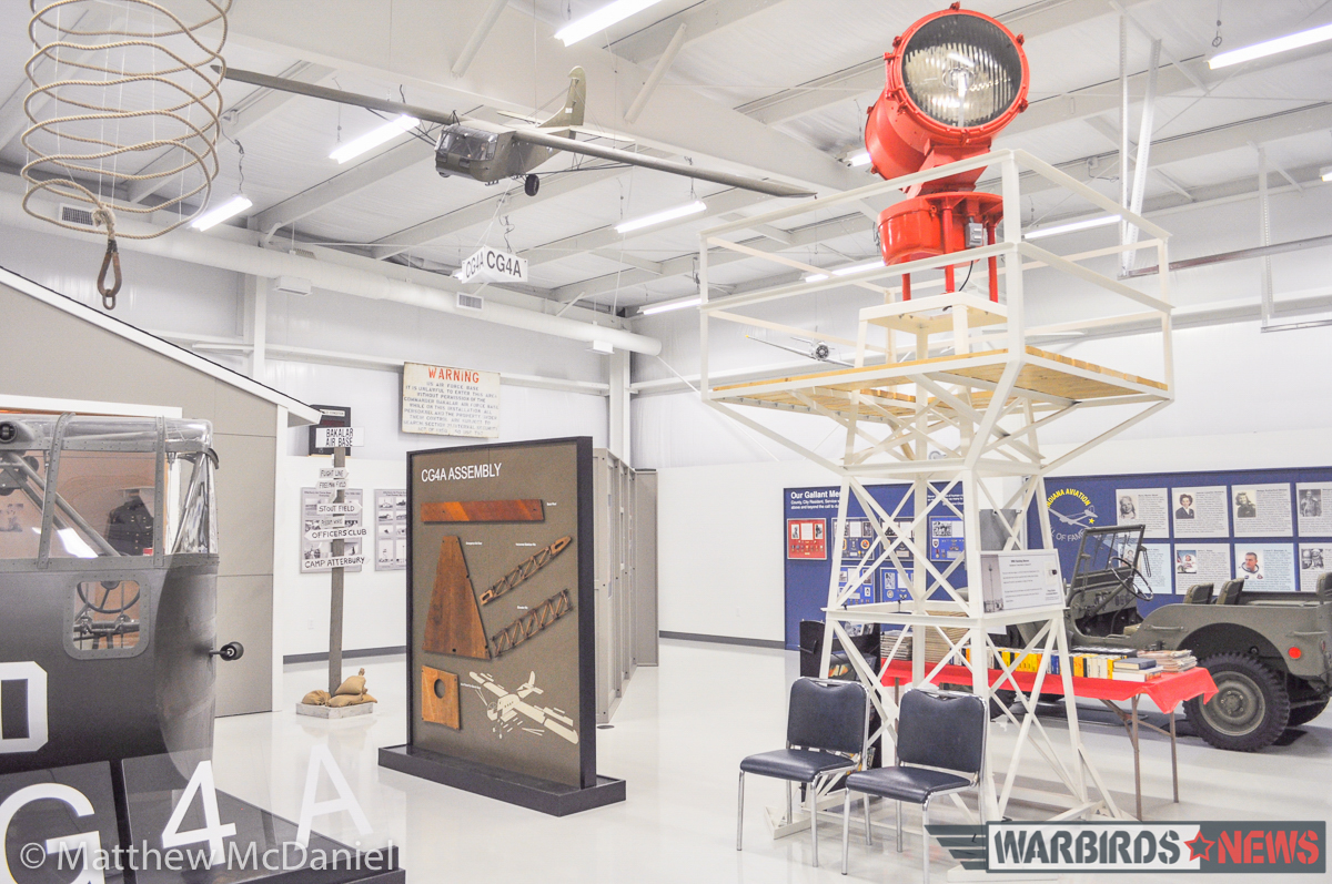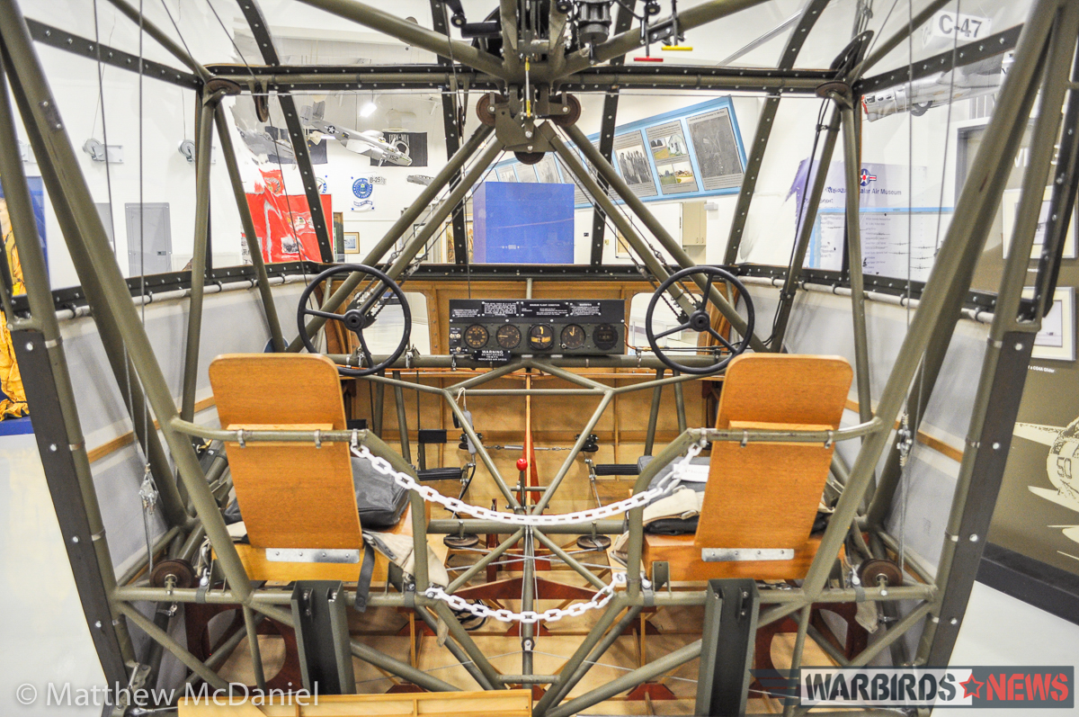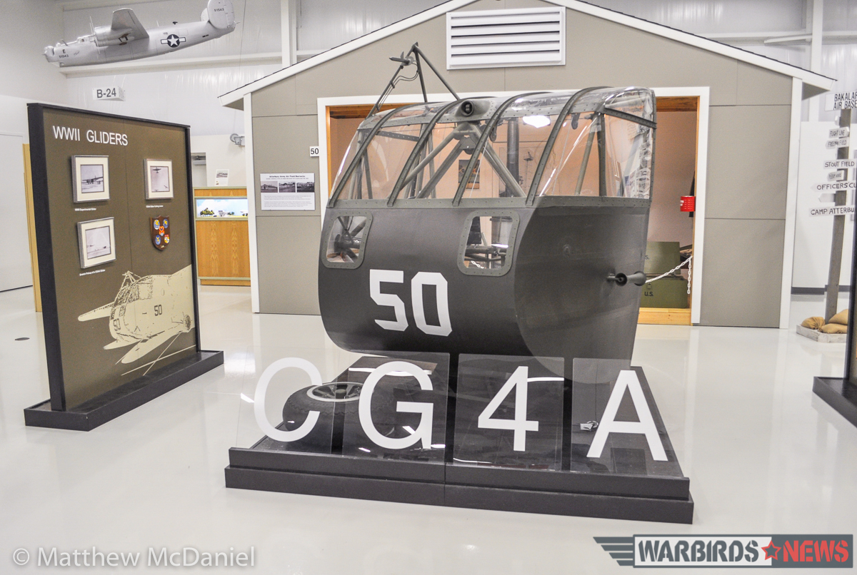There is a full-scale replica of a portion of one of the typical barracks buildings that once housed hundreds of airmen on the base. Many such barracks buildings survived into the 1990’s, but most are gone now. One exception is the Base Chapel which, externally, resembles the barracks buildings typical to the Base, albeit with the addition of a steeple and more attractive main entrance. Museum volunteers have completed a detailed and historically accurate restoration, effectively making the chapel a museum annex (as it’s located a few blocks from the main museum site). However, the crown jewel of the museum’s collection is a fully restored cockpit section from a rare Waco CG-4A combat glider. Used for both troop and cargo transport, the Waco weighed in at a whopping 7,500 lbs. when fully loaded with its official maximum payload of 3,900lbs. However, the gliders routinely operated at 9,000lbs or more when they carried “emergency loads” (including Jeeps, Howitzers, ammunition, and/or battle-ready troops) into combat zones. The museum’s CG-4A cockpit is accurately detailed in every way, including fully functional flight controls. Best of all, it is displayed at floor level, where every nuance can be examined by visitors. The most recent expansion to the museum added a theater/media-room designed to evoke the inside of a CG-4. Actual CG-4A bench seats line the side walls and the room is trimmed with wooden framework and portholes similar to the glider’s interior!