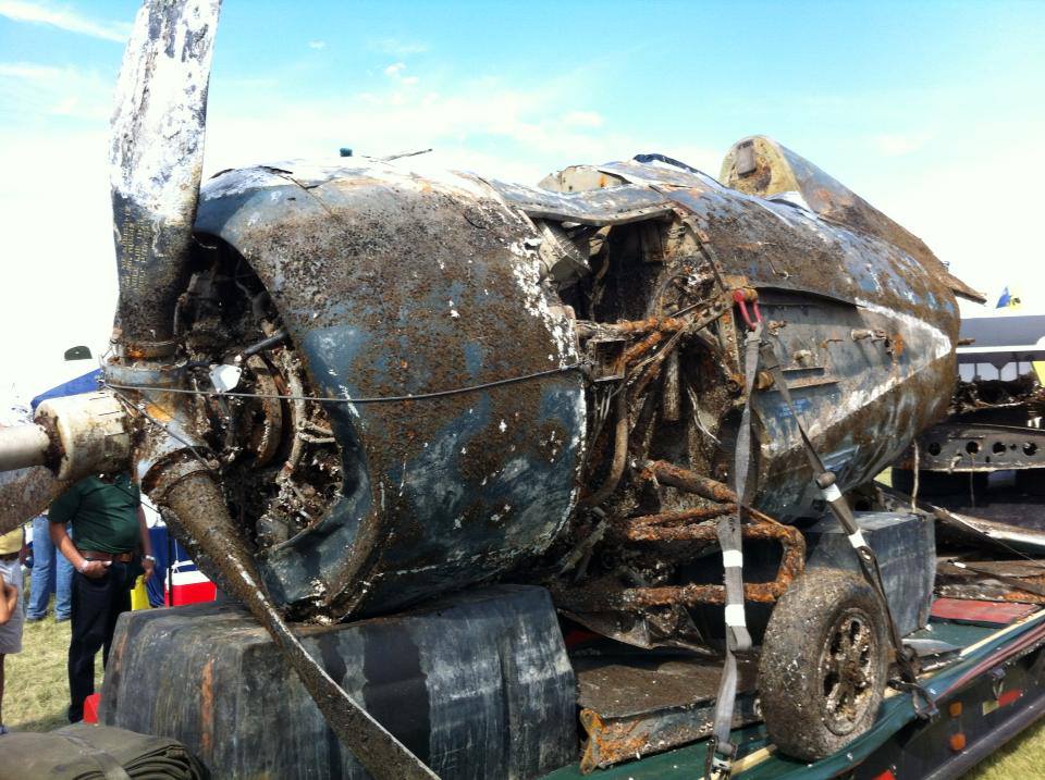 The General Motors-built FM-2 suffered engine failure while taking off from the carrier training ship, USS Sable. While the plane sat sinking in the icy waters it was run over by the Sable, breaking the fuselage just behind the canopy. The pilot, Ensign William Forbes, managed to escape both the fighter and the oncoming ship before the airplane sank.