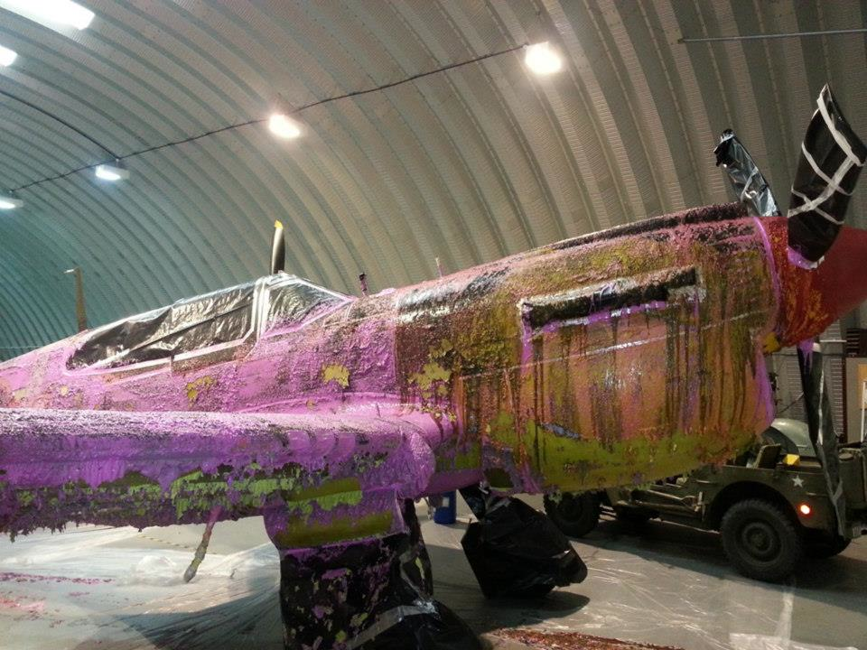 In conjunction with its usual annual service the plane is being stripped down to bare metal, the performance of which has revealed several of the plane’s previous color schemes that had been applied to it over the decades as well as a number of the original Curtiss-Wright identification plates which had been obscured by layer upon layer of paint. The plane will be freshly repainted for the 2013 airshow season, however Peter Teichman, the owner of the Hanger 11 Collection is keeping the the new paint scheme for his P-40 a secret for now, though he hints that it will be a unique color scheme, not seen since the war as far as he’s aware.