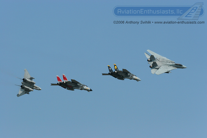 Below is a photo of a flight of four F-14s from the “Tomcatters” of Fighter Squadron Thirty One (VF-31) at the 2006 Naval Air Station Oceana Air Show during the Navy Air Power Demonstration. Aviation Enthusiasts founder Antony Svihlik, was a Plane Captain on Tomcats during his time in the Navy. Be sure to visit the full website at www.aviation-enthusiasts.com for more aviation and air show memories!