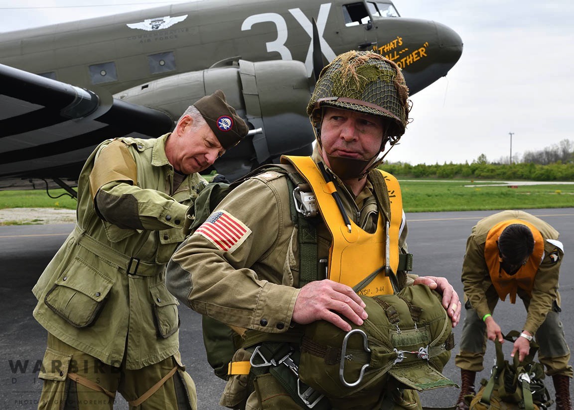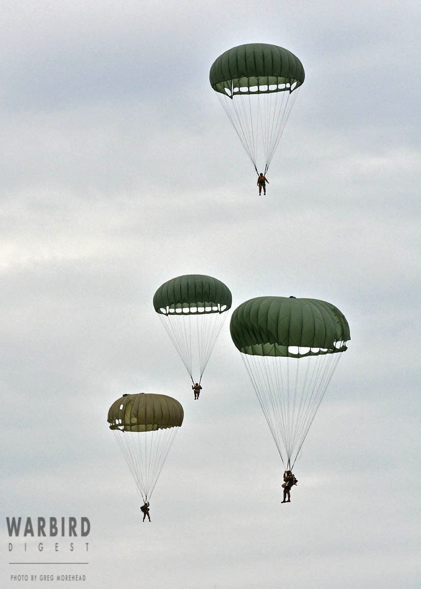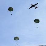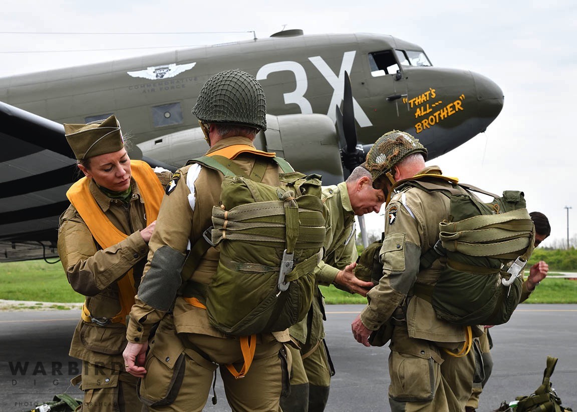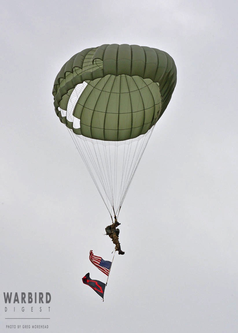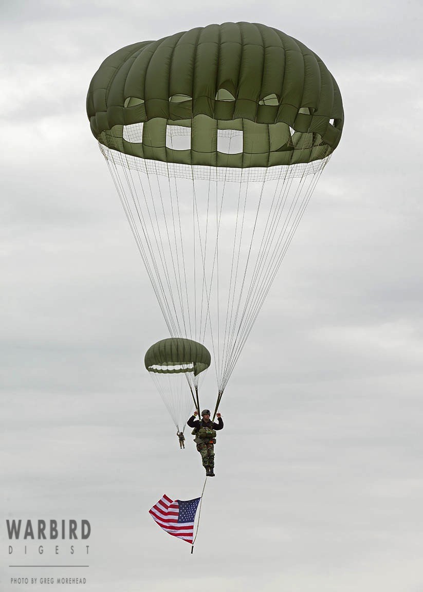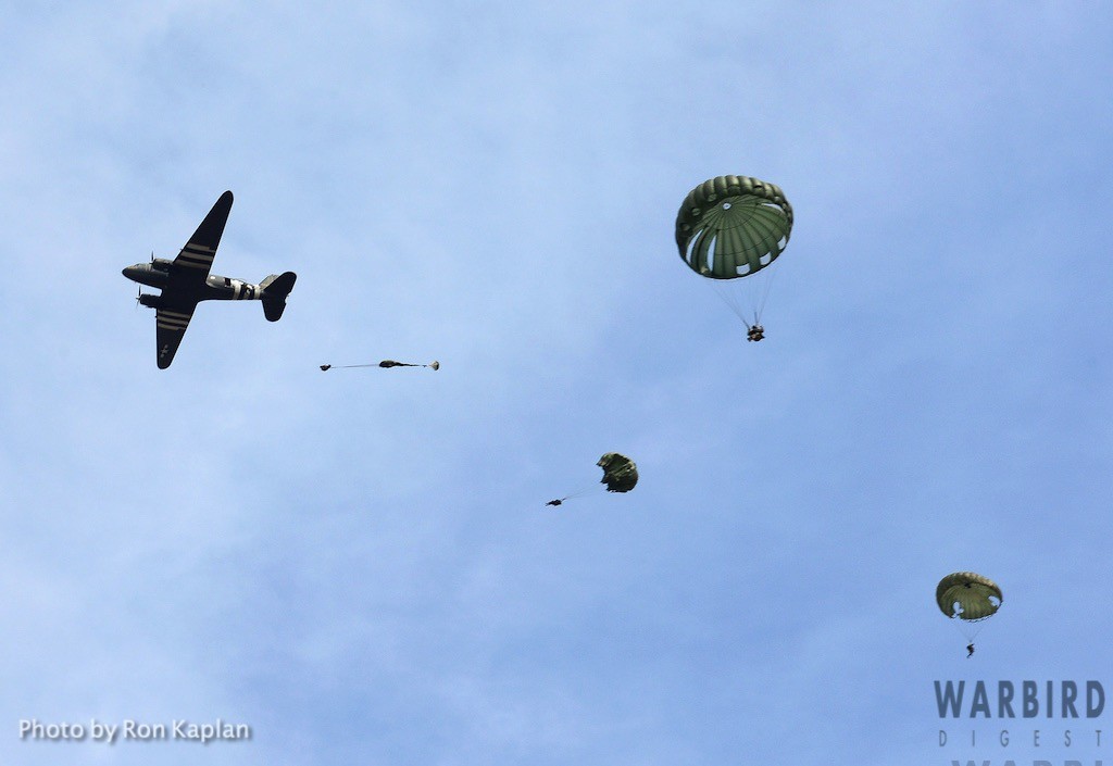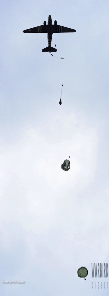 The Commemorative Air Force (CAF), which owns and operated the aircraft used, conducted the flyover and mass parachute drop using three restored and preserved aircraft: C-47 “That’s All Brother,” C-47 “Placid Lassie” of the Tunison Foundation, and C-53 “D-Day Doll.” In addition, tandem parachuting was opened to the public on all three days after the initial drops were completed.