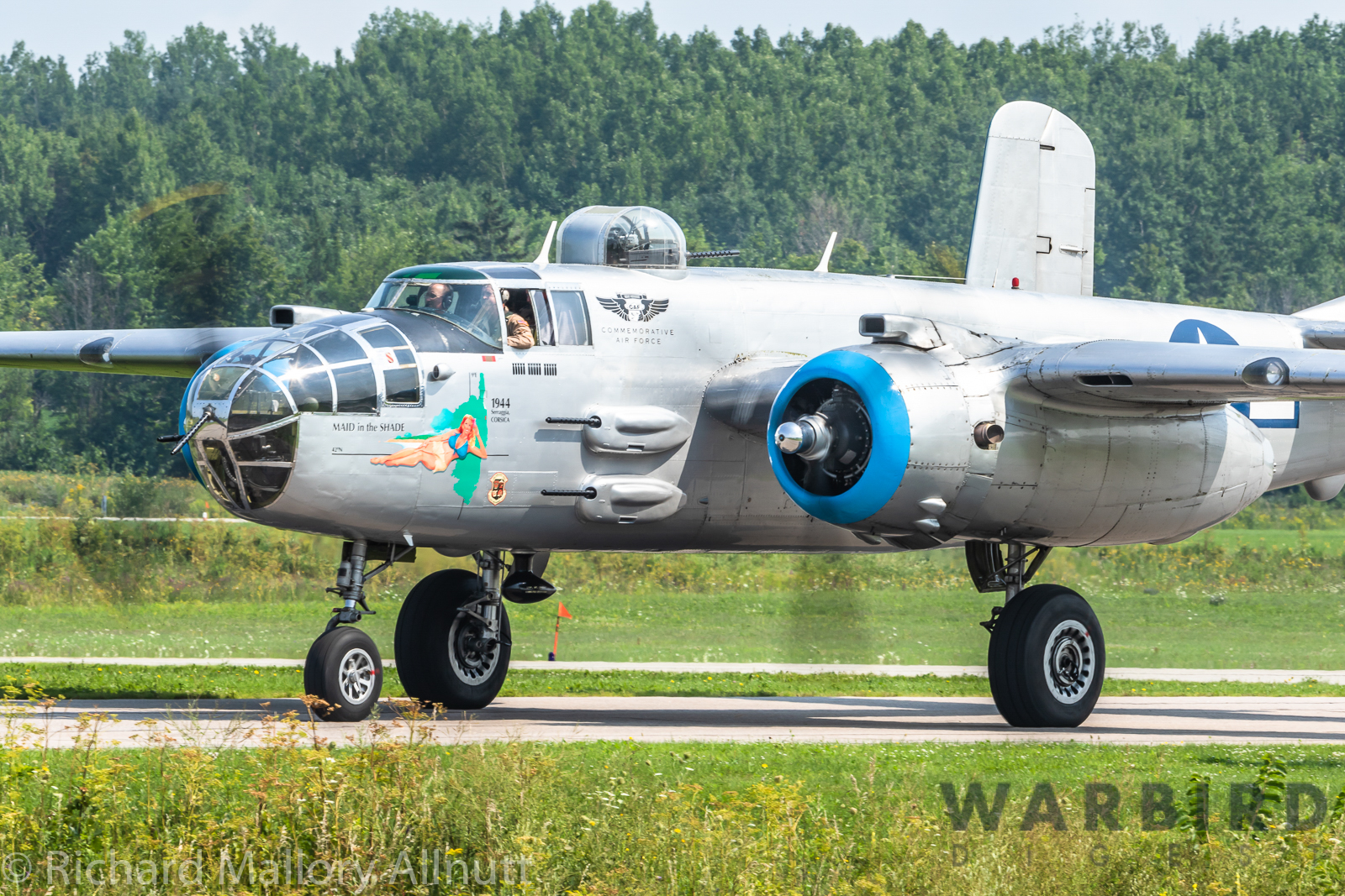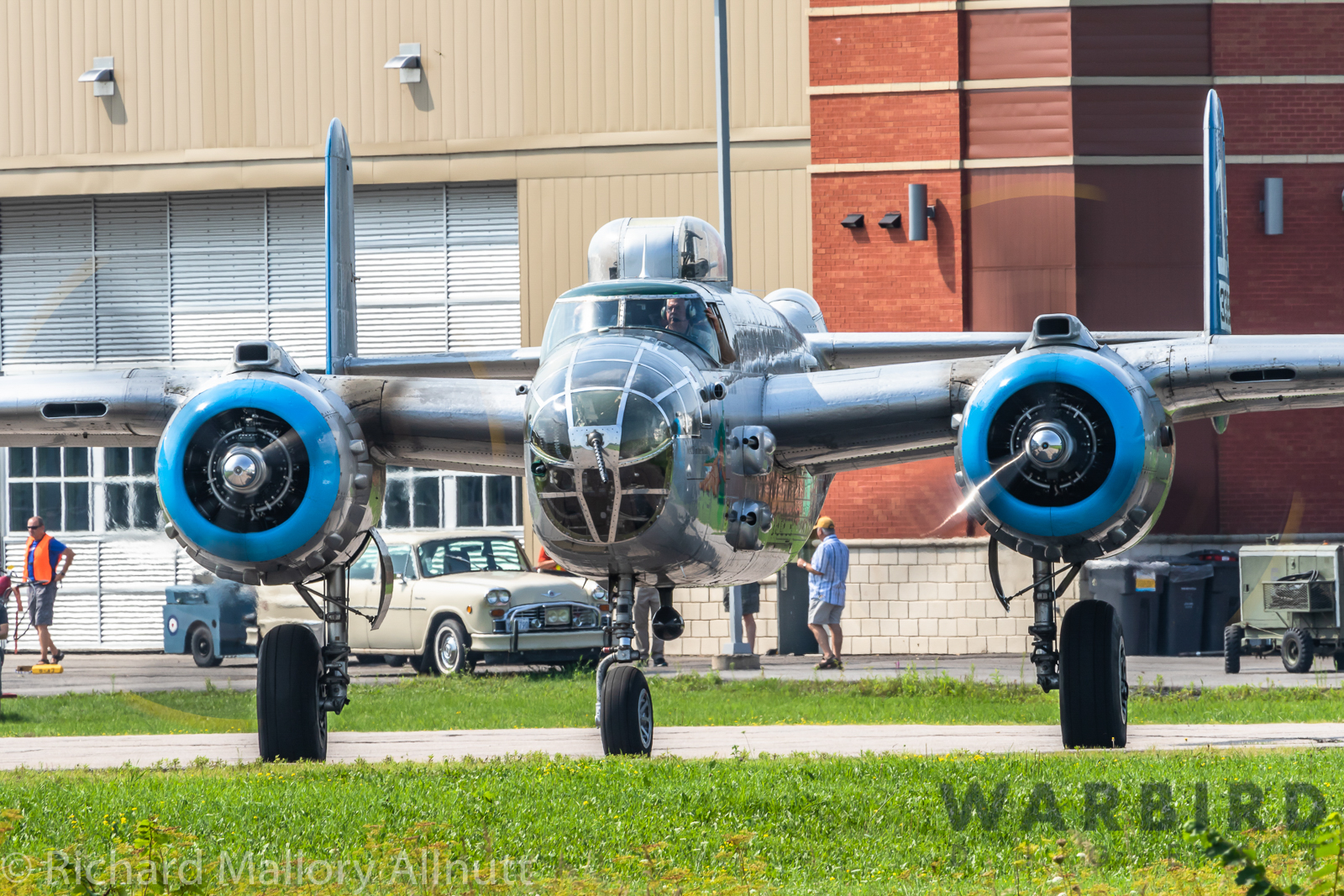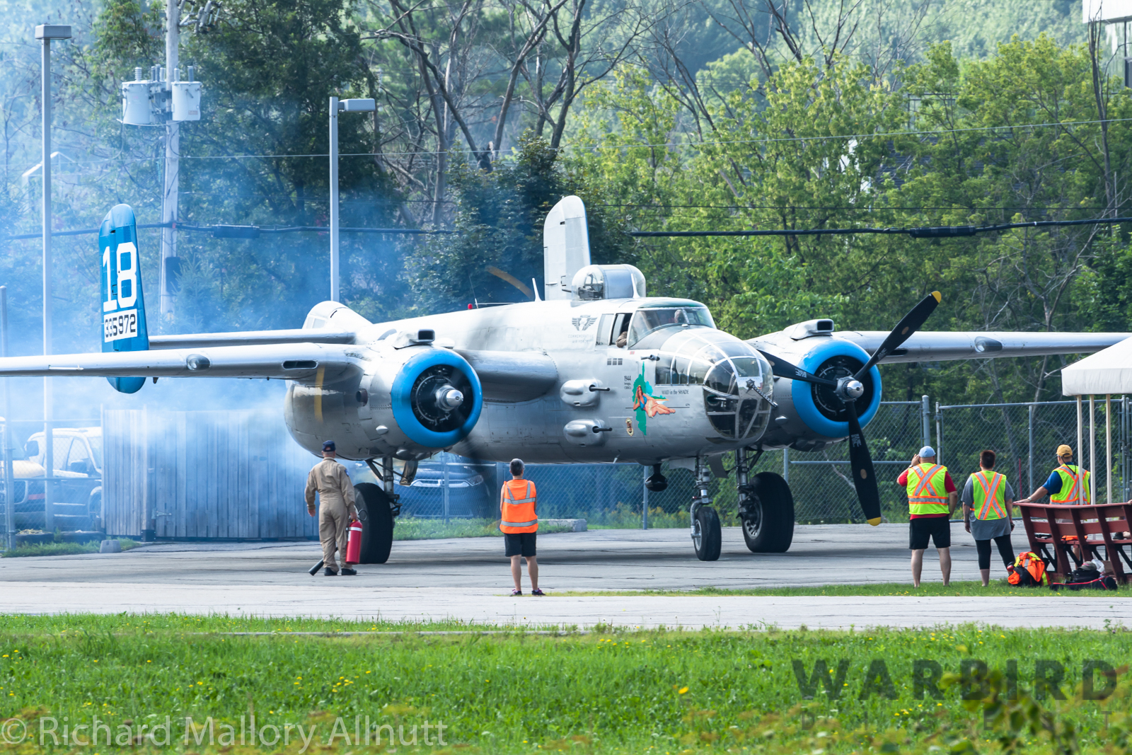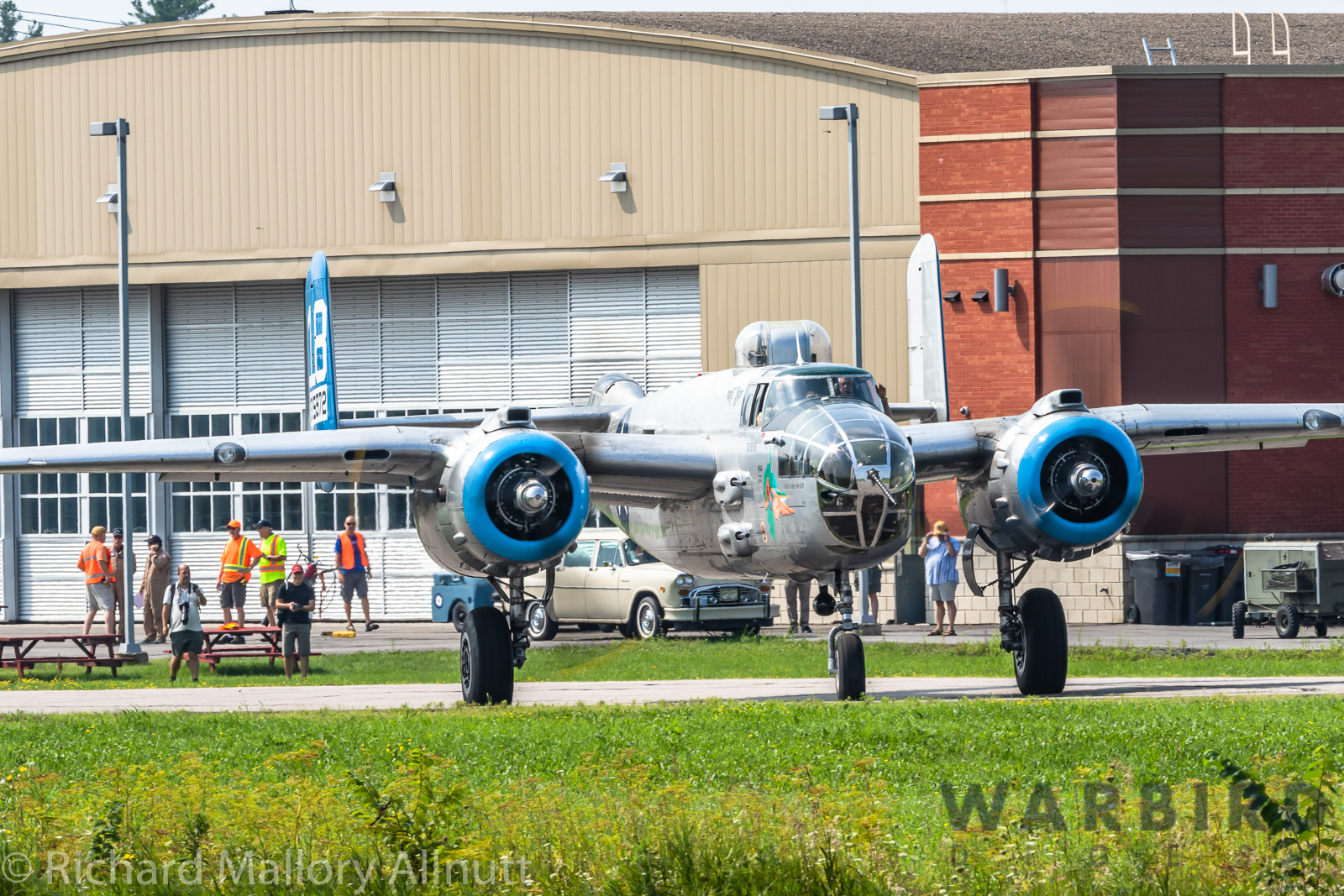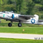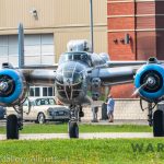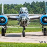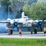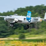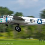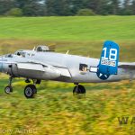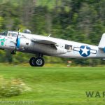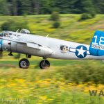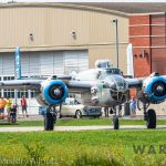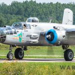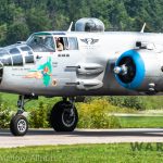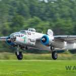 It was sweltering on Monday morning even standing in the shade outside Vintage Wings of Canada’s hangar in Gatineau, Quebec. A small crowd of local media members were huddled together alongside the flying collection’s dedicated band of volunteers awaiting the arrival of a special visitor. The Commemorative Air Force’s North American B-25J Mitchell Maid in the Shade was due to arrive any moment now, as we carefully made our way out to a small patch of ground near one of the taxi-ways for a closer look with our cameras as the combat veteran bomber arrived. We waited in the baking heat for some time until the familiar thrum of her engines started echoing off the nearby hills. André Laviolette, one of Vintage Wings’ stalwart technicians was the first to spot the bomber on the horizon as she made her way through the soupy haze along the Ottawa River Valley towards the circuit at Gatineau Executive Airport. Then down she came, so gracefully, to touch her main wheels on the runway, her pilot holding her nose high during rollout to bleed off speed more efficiently, and reduce brake-wear. Finally her nose lowered, and she slowed to a stroll before turning onto the taxiway for the journey towards Vintage Wings hangar; the characteristic clatter of the B-25’s unique exhaust stack arrangement creating a kind of music for those of us who love these classic propeller planes.