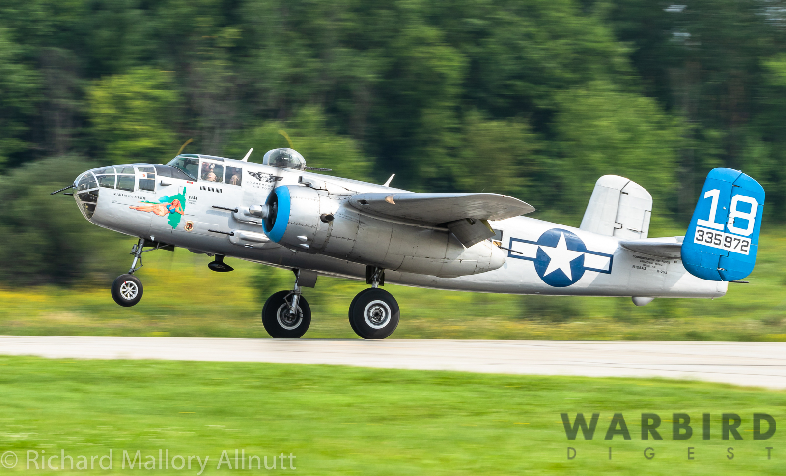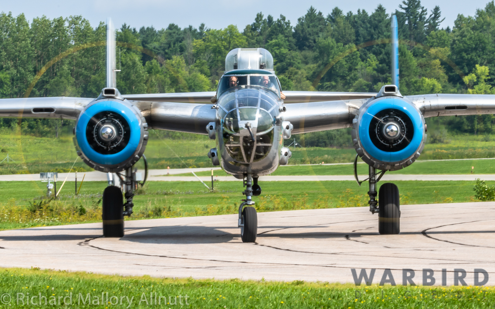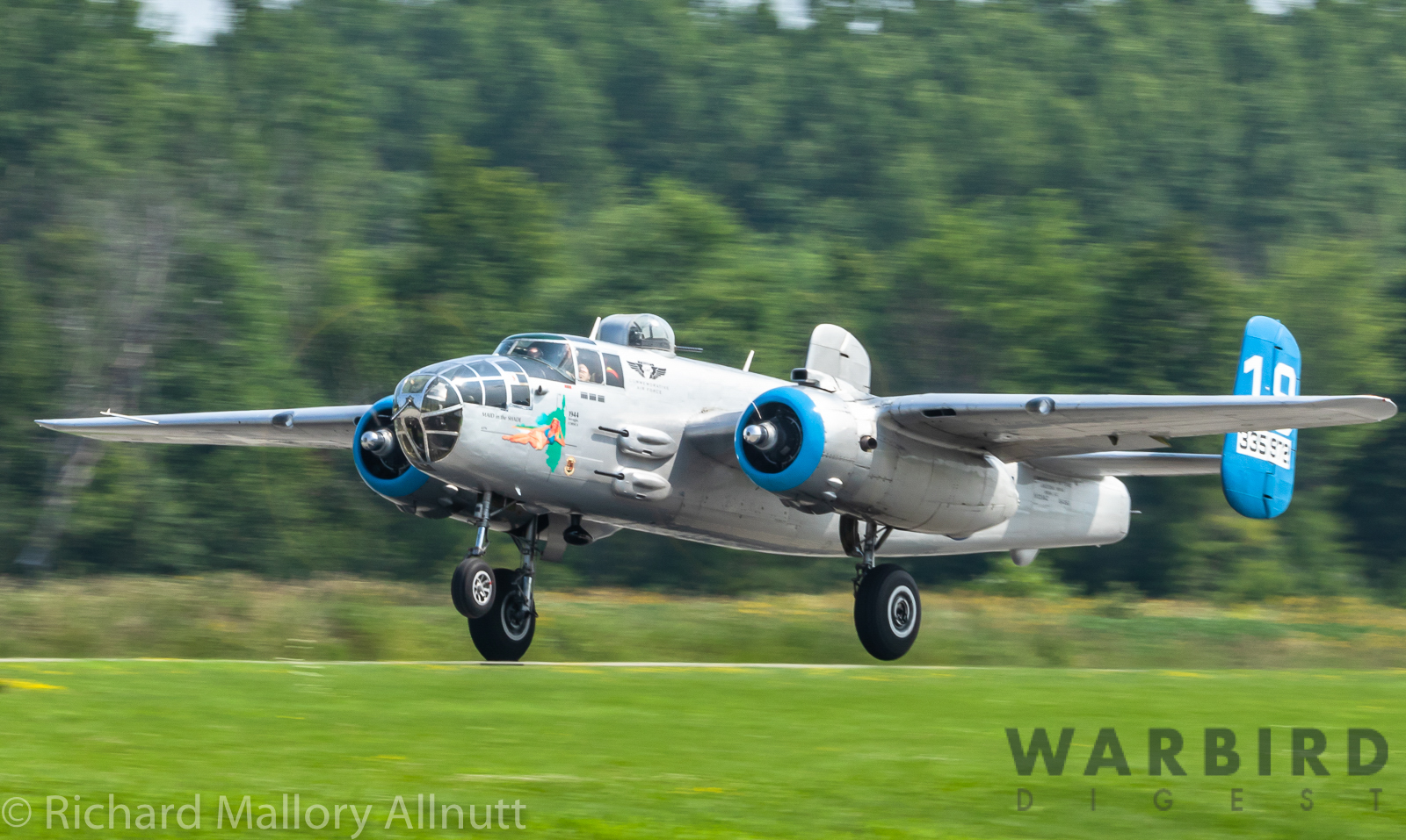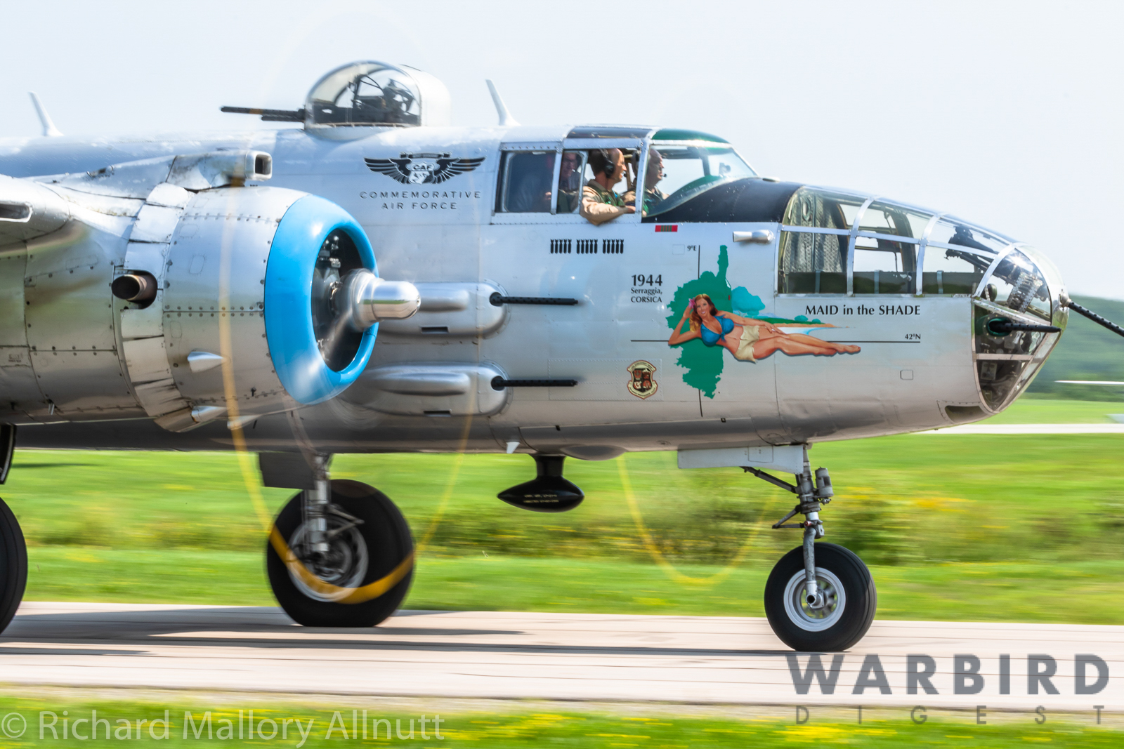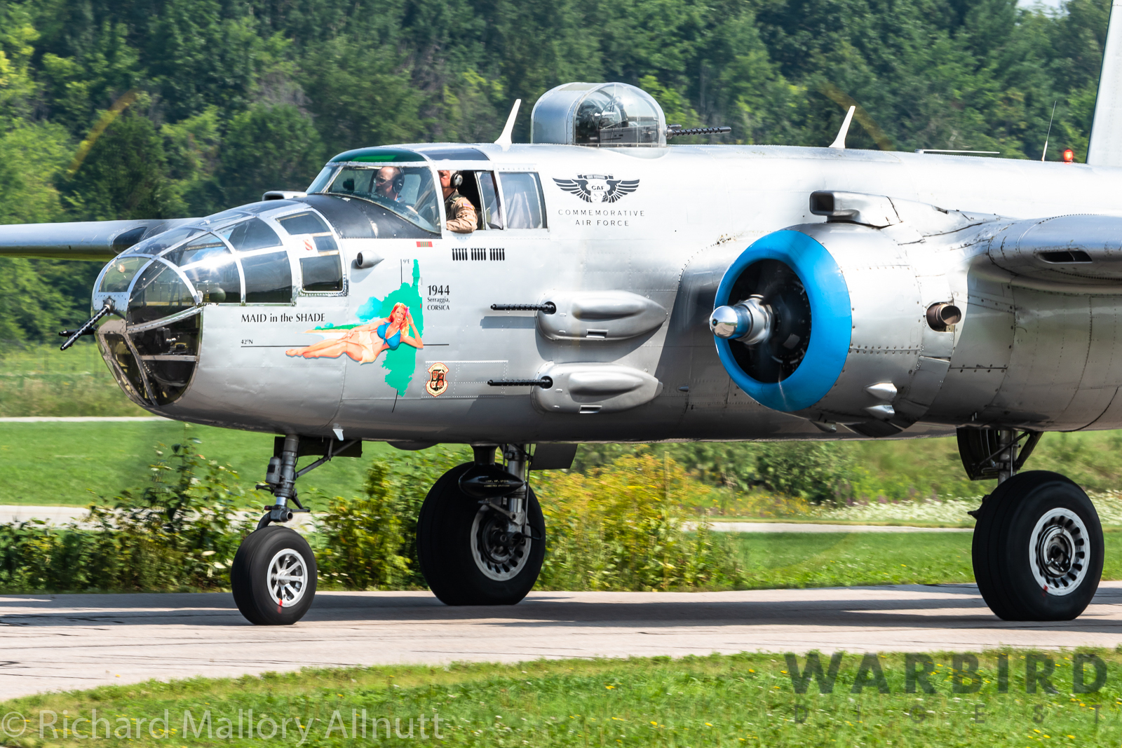 It was sweltering on Monday morning even standing in the shade outside Vintage Wings of Canada’s hangar in Gatineau, Quebec. A small crowd of local media members were huddled together alongside the flying collection’s dedicated band of volunteers awaiting the arrival of a special visitor. The Commemorative Air Force’s North American B-25J Mitchell Maid in the Shade was due to arrive any moment now, as we carefully made our way out to a small patch of ground near one of the taxi-ways for a closer look with our cameras as the combat veteran bomber arrived. We waited in the baking heat for some time until the familiar thrum of her engines started echoing off the nearby hills. André Laviolette, one of Vintage Wings’ stalwart technicians was the first to spot the bomber on the horizon as she made her way through the soupy haze along the Ottawa River Valley towards the circuit at Gatineau Executive Airport. Then down she came, so gracefully, to touch her main wheels on the runway, her pilot holding her nose high during rollout to bleed off speed more efficiently, and reduce brake-wear. Finally her nose lowered, and she slowed to a stroll before turning onto the taxiway for the journey towards Vintage Wings hangar; the characteristic clatter of the B-25’s unique exhaust stack arrangement creating a kind of music for those of us who love these classic propeller planes.