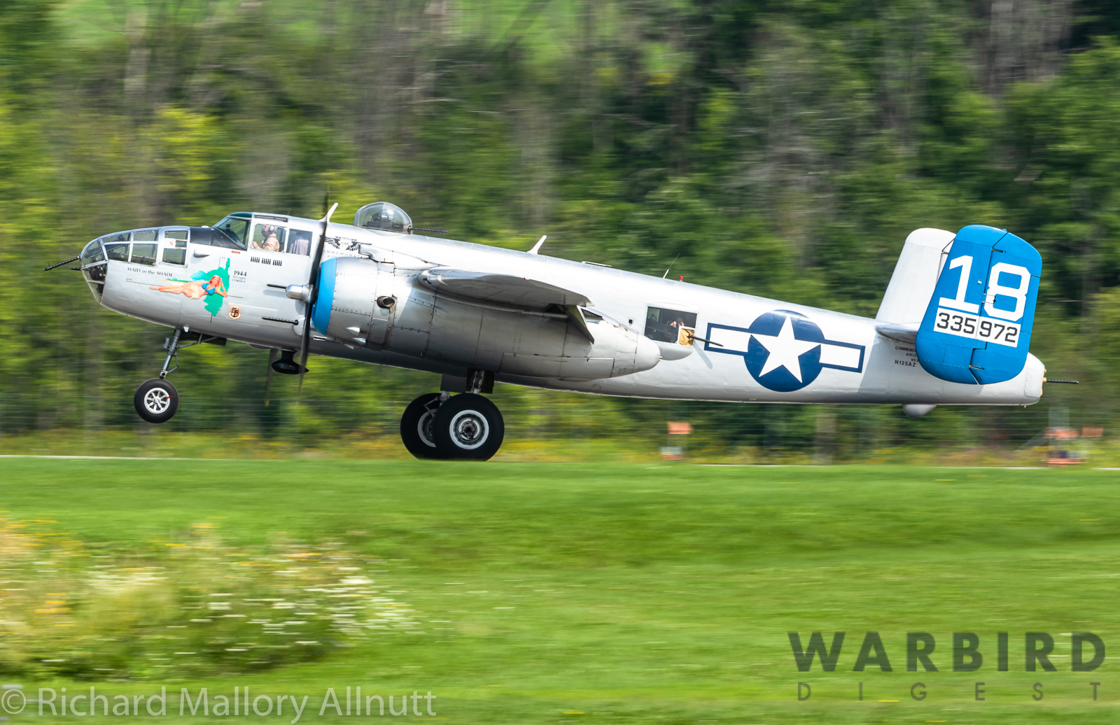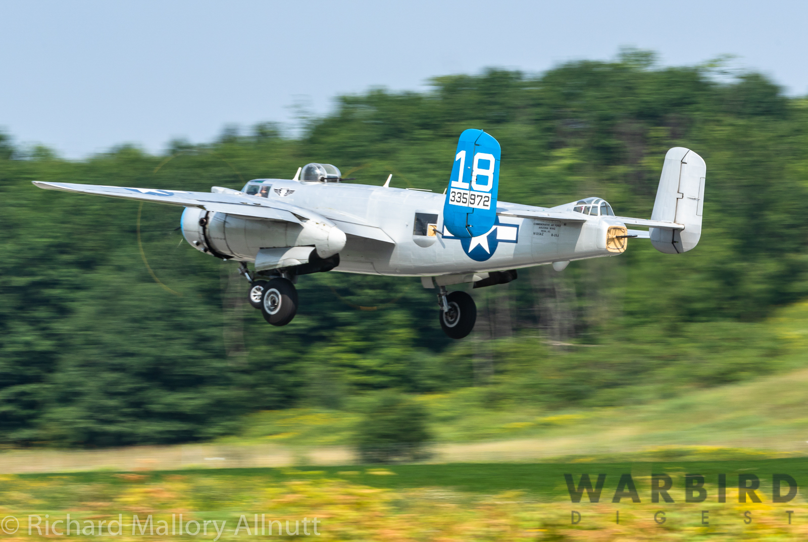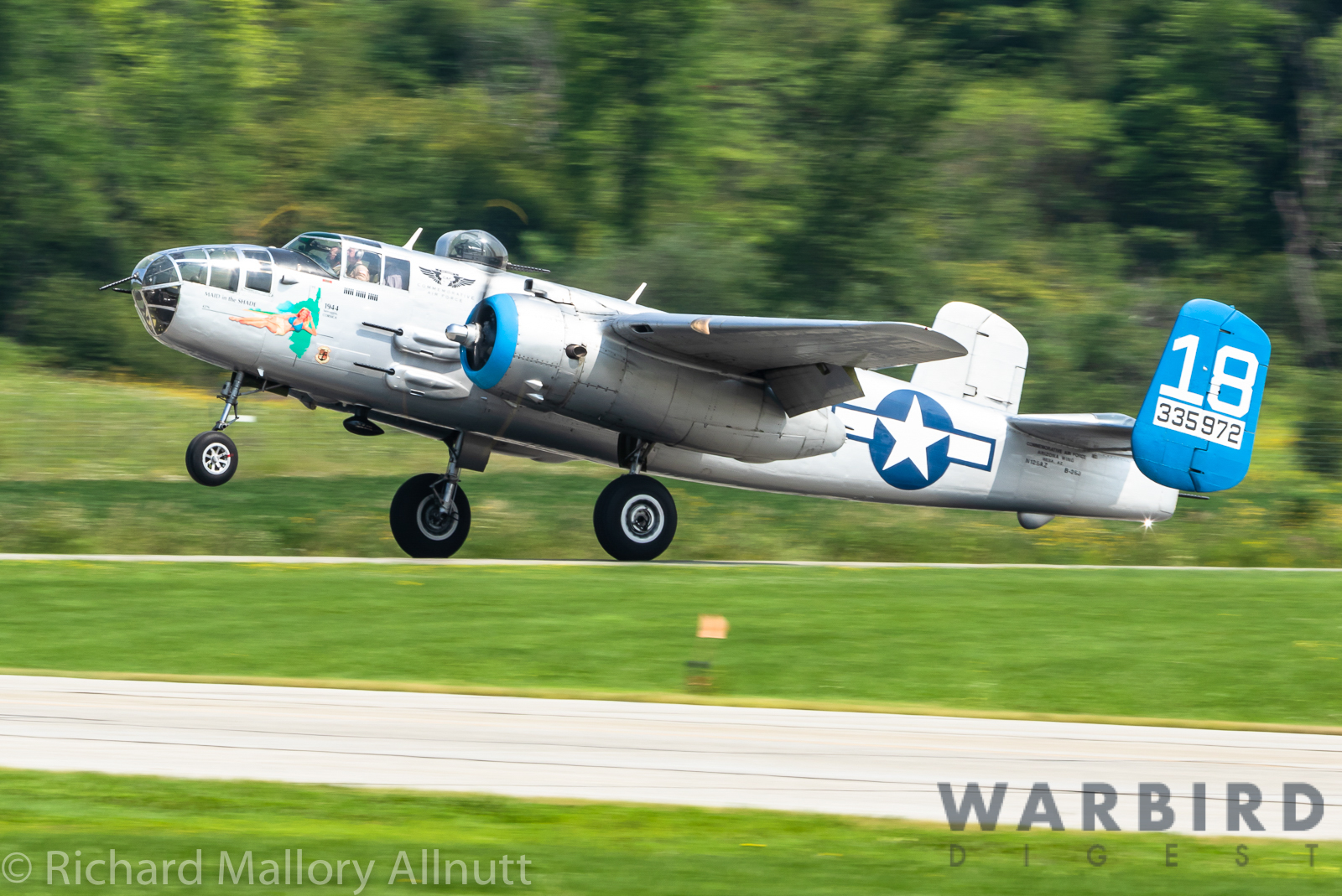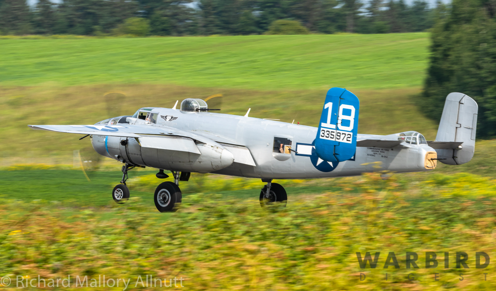 It was sweltering on Monday morning even standing in the shade outside Vintage Wings of Canada’s hangar in Gatineau, Quebec. A small crowd of local media members were huddled together alongside the flying collection’s dedicated band of volunteers awaiting the arrival of a special visitor. The Commemorative Air Force’s North American B-25J Mitchell Maid in the Shade was due to arrive any moment now, as we carefully made our way out to a small patch of ground near one of the taxi-ways for a closer look with our cameras as the combat veteran bomber arrived. We waited in the baking heat for some time until the familiar thrum of her engines started echoing off the nearby hills. André Laviolette, one of Vintage Wings’ stalwart technicians was the first to spot the bomber on the horizon as she made her way through the soupy haze along the Ottawa River Valley towards the circuit at Gatineau Executive Airport. Then down she came, so gracefully, to touch her main wheels on the runway, her pilot holding her nose high during rollout to bleed off speed more efficiently, and reduce brake-wear. Finally her nose lowered, and she slowed to a stroll before turning onto the taxiway for the journey towards Vintage Wings hangar; the characteristic clatter of the B-25’s unique exhaust stack arrangement creating a kind of music for those of us who love these classic propeller planes.