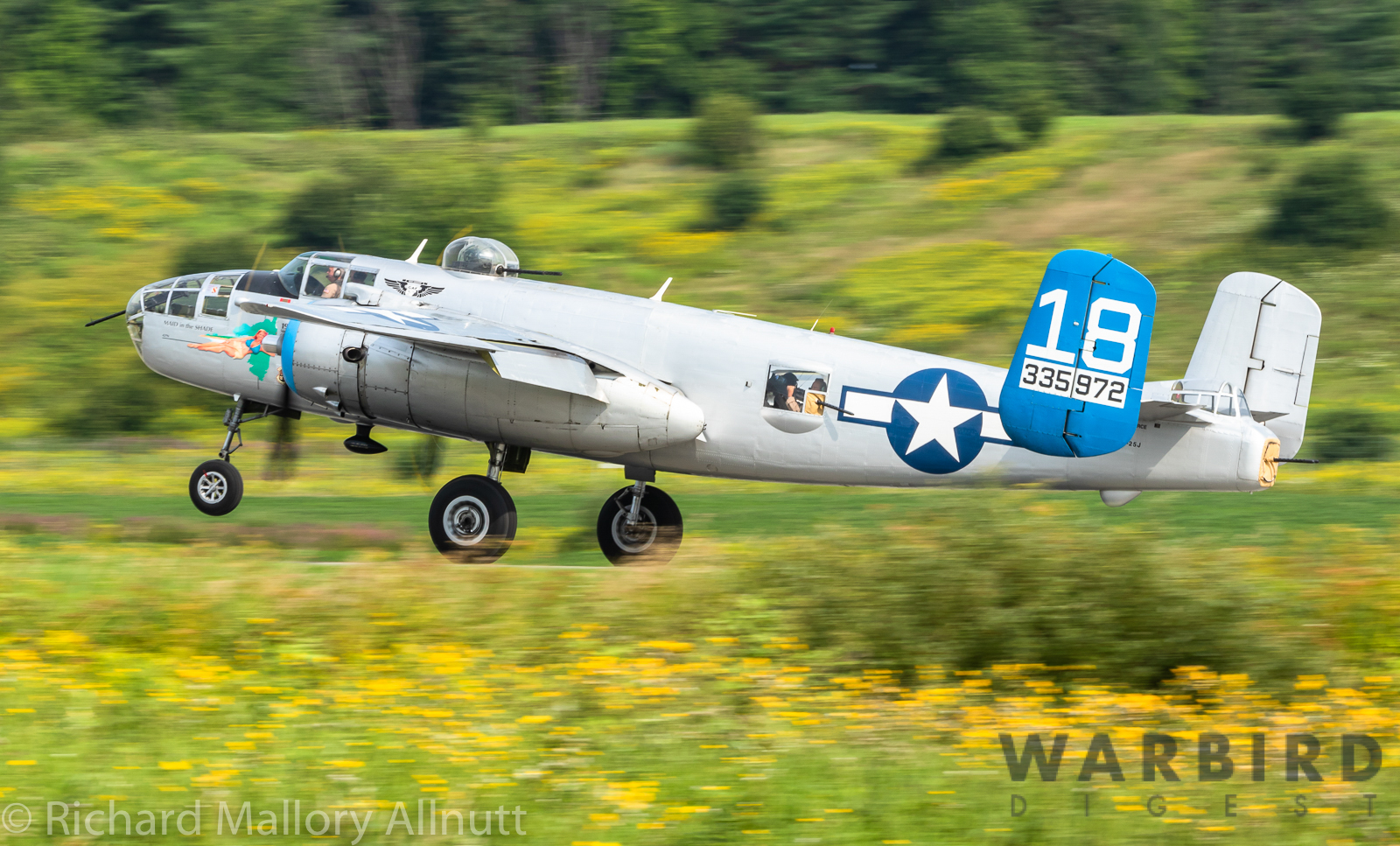 This B-25, serial 43-35972, is one of just a handful of Mitchells which saw combat in WWII which are still capable of flight. She flew about 15 operational missions with the 319th Bomb Group, 437th Squadron from Serraggia, Corsica between November 1st and December 31st, 1944. While her name and nose-art are fictitious, she did wear the code “18” during this period. She has been with the CAF since her donation in 1982, after-which she underwent a nearly 30 year, down-t0-the-last-rivet restoration. Her current home is with the CAF’s Airbase Arizona in Mesa, Arizona, but she spends much of the year barnstorming around North America giving rides to the public for a small donation. She is currently on the Canadian leg of her tour, and will be in Gatineau until August 12th. Her next port of call will be St.Hubert, Quebec. To book a ride aboard this amazing aircraft, please click HERE.